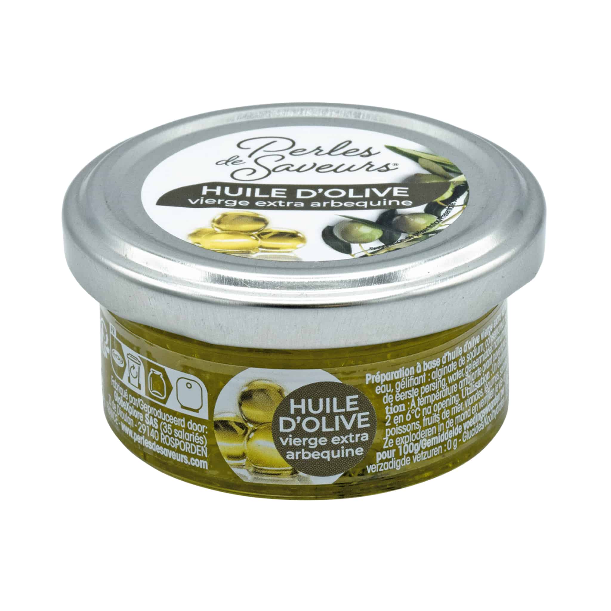 Product formulations and details may change. For the latest ingredients and allergen information always check product packaging prior to consumption. Ingredients: Extra virgin olive oil 54%; water; gelling agent: sodium alginate; firming agent: calcium chloride; acidifying agent: citric acid.