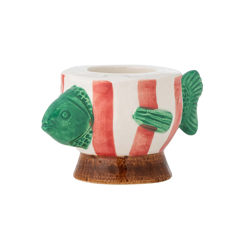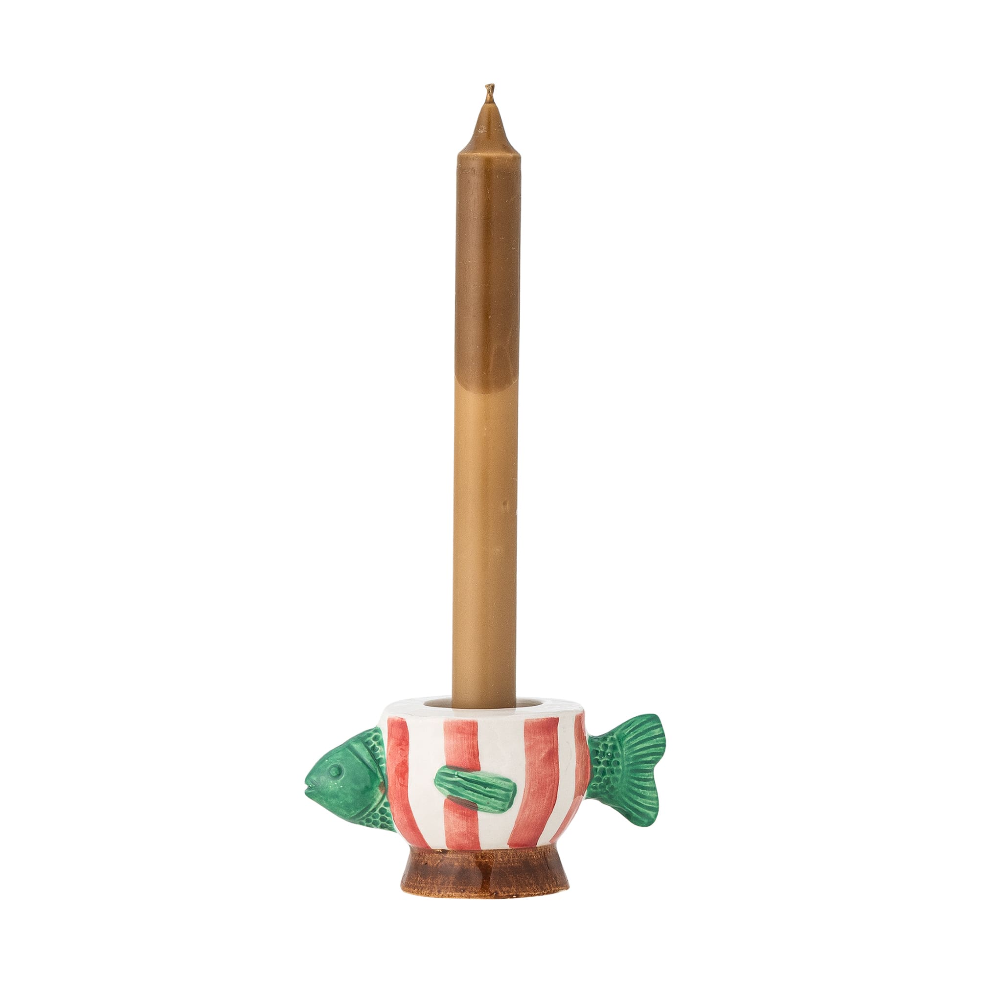 The Codia candle holder has a funky fish design. The red and white stripes add a pop of colour to any room. The green head and tail feature delicate hand-painted scales.