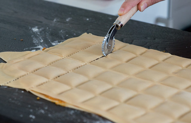 Ravioli making comes into its own with a ravioli rolling pin used to quickly and efficiently shape and seal ravioli from sheets of fresh pasta. Modelled on the original rolling tool used in Ligurian kitchens, the roller is crafted from beechwood making it hard and durable. The complete pasta making kit also contains ravioli stamps with beautiful beechwood handles. And if you'd prefer to think outside the box and shape your own ravioli the fluted pastry wheel can be used to create soft, waved edges out of homemade pasta.