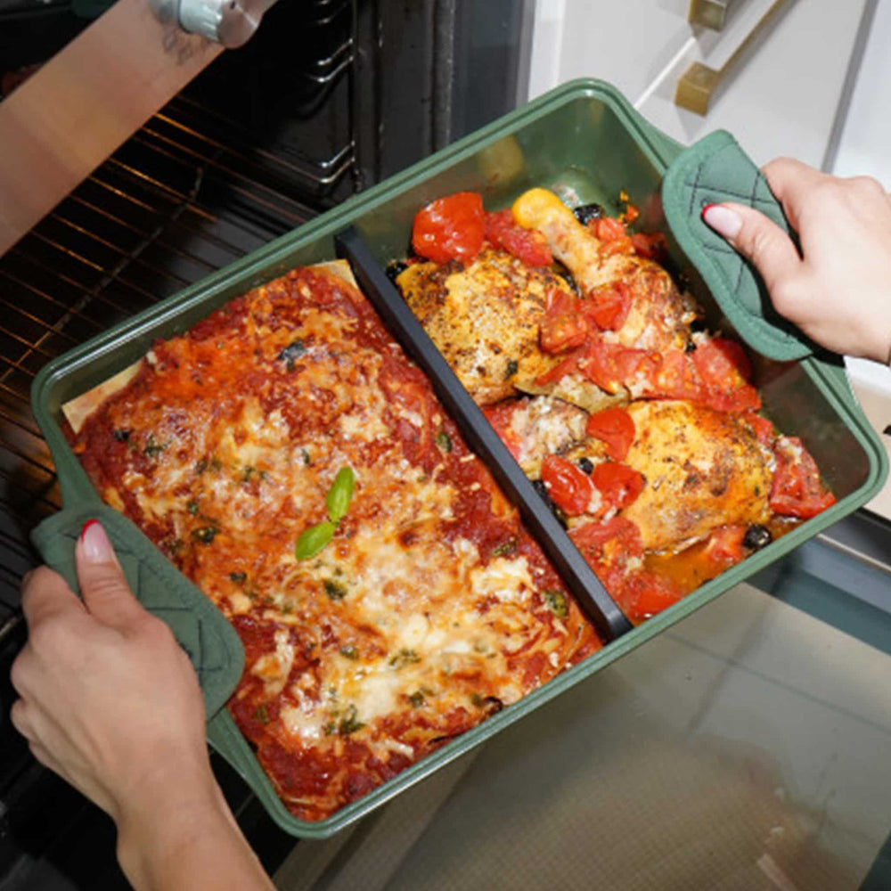 The divider turns this classic roasting dish into a multi-purpose meal prep tool. It’s perfect for batch cooking and roasting veggies for the week ahead.