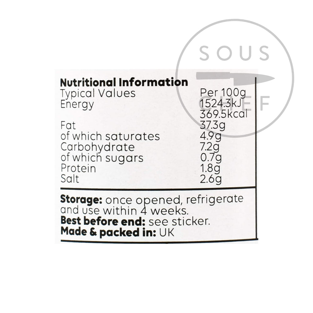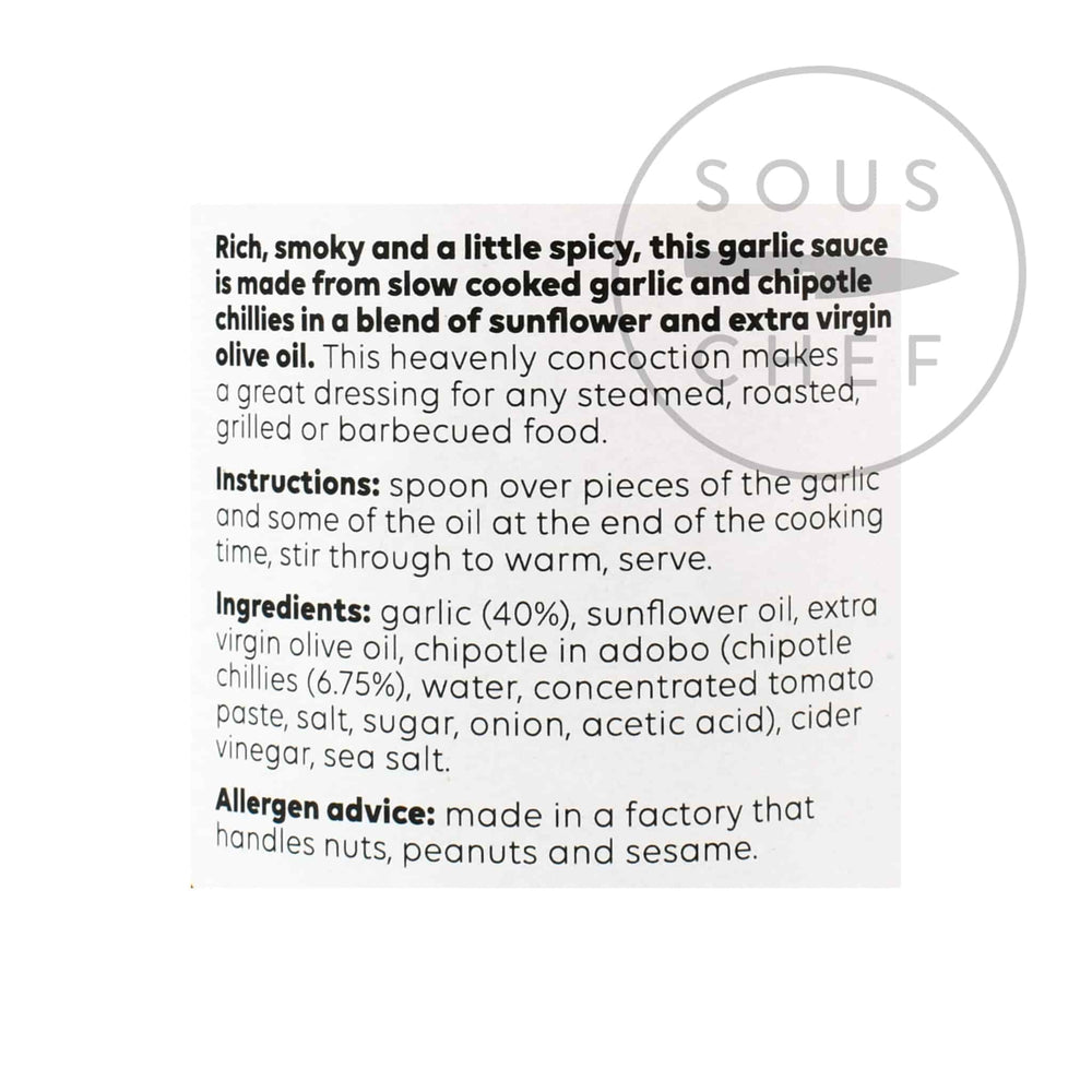 Product formulations and details may change. For the latest ingredients and allergen information always check product packaging prior to consumption. Ingredients: Garlic (40%), sunflower oil (26%), extra virgin olive oil (12%), chipotle in adobo (chipotle chillies (6.75%), water, concentrated tomato paste, salt, sugar, onion, acetic acid), cider vinegar, sea salt