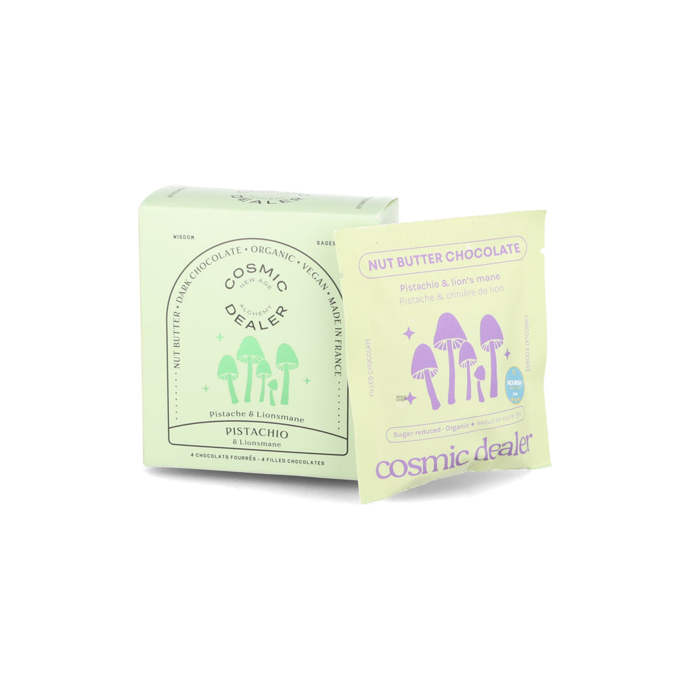 Cosmic Dealer pistachio and lion’s mane chocolates will surprise and delight your taste buds. The box contains four large squares covered in dark chocolate.