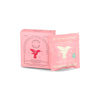 Cosmic Dealer’s raspberry and buckwheat chocolates have a delicious nut butter centre. The pink box contains four large squares covered in dark chocolate.