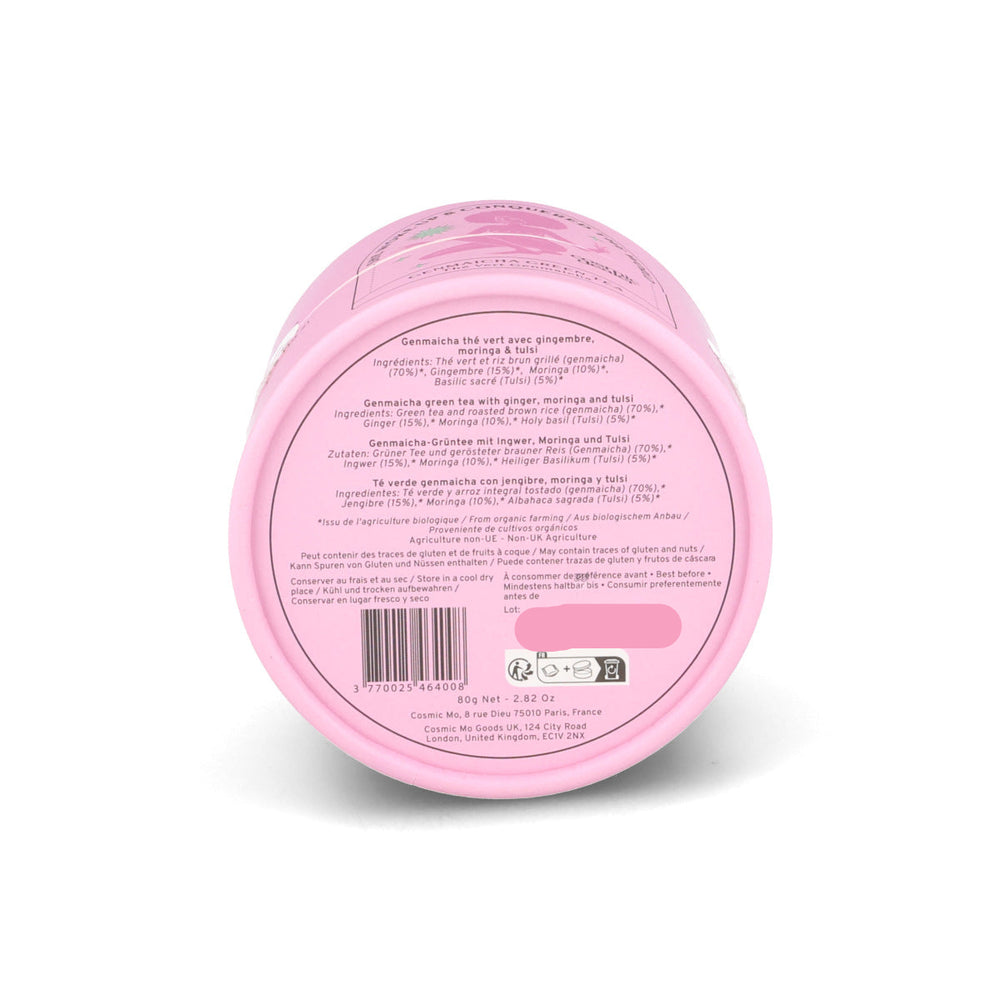 Cosmic Dealer genmaicha and ginger tea is an invigorating blend. Genmaicha is a Japanese green tea combined with toasted rice. It has a nutty, comforting flavour.