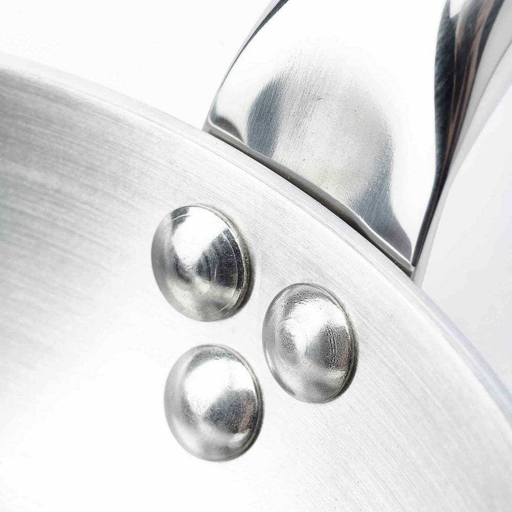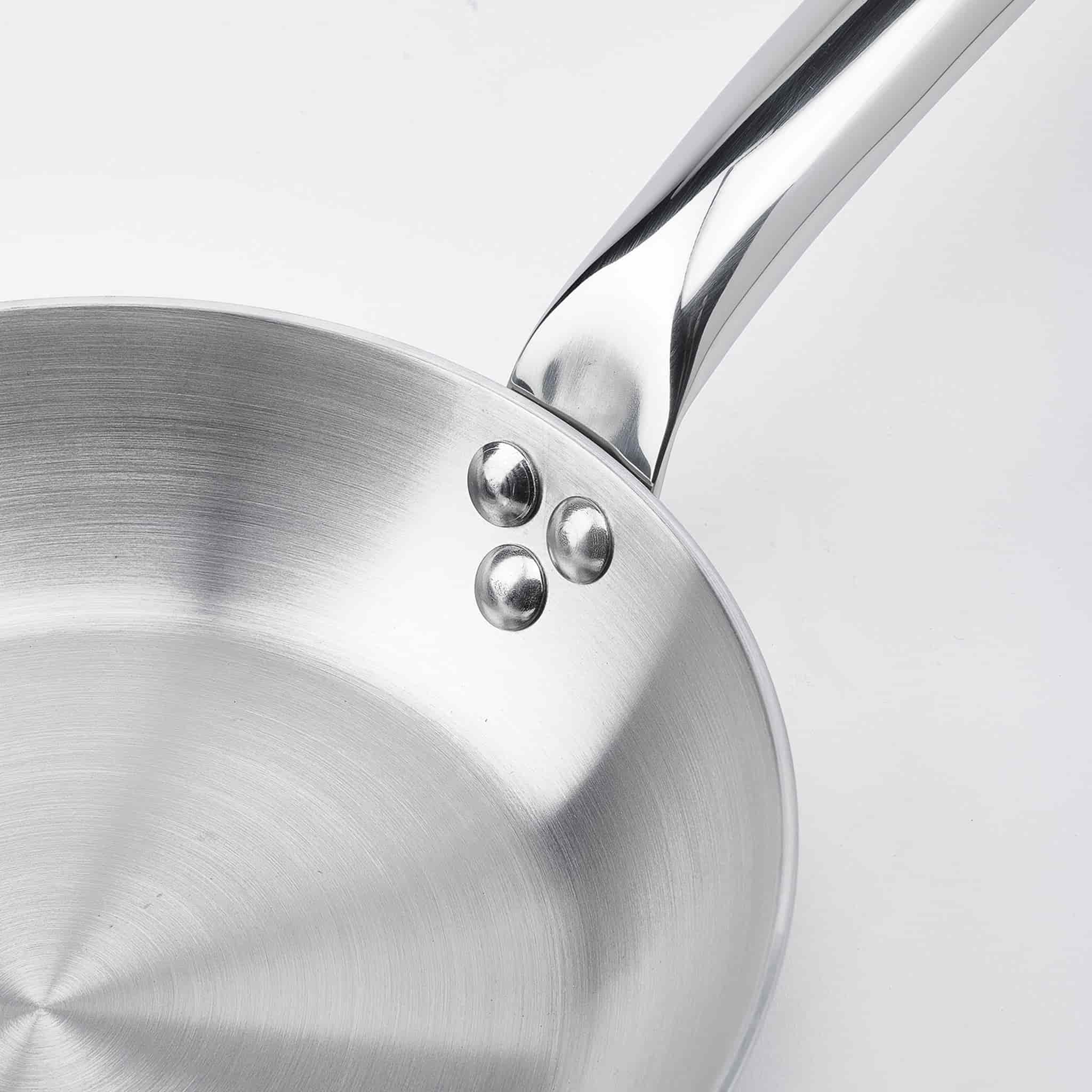 The frying pan has an ergonomic handle, cast from stainless steel and riveted to the pan for durability.