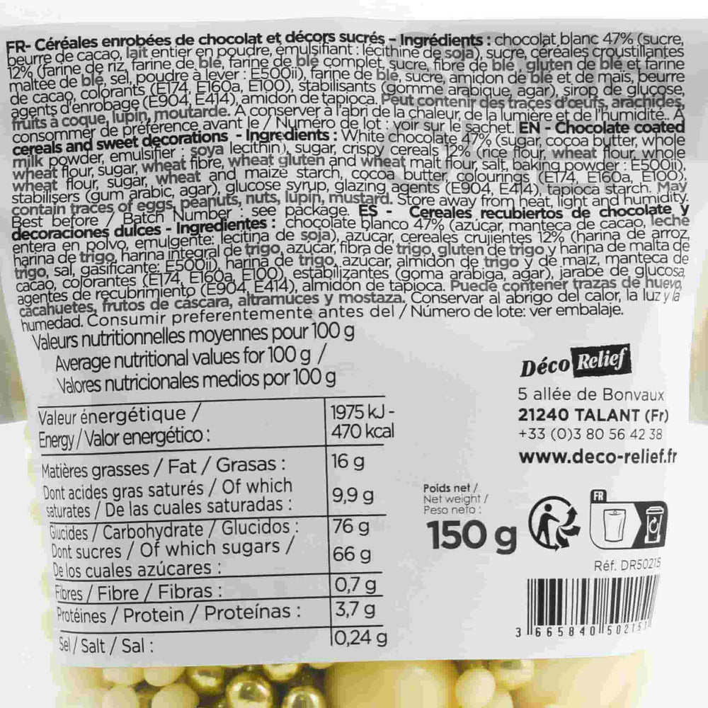 Use Déco Relief white chocolate and golden decorating pearls to give bakes that finishing touch. Made from creamy white chocolate, they have a crisp cereal centre. They’re a fun way to add crunch and sparkle to cakes and cookies.