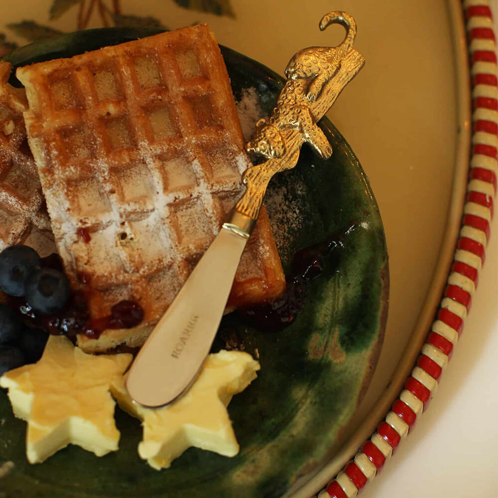 The Jenna leopard butter knife adds character to your table. It has a steel blade and a handle made from recycled brass. The handle is shaped like a leopard snoozing on a branch. This quirky butter knife is perfect for animal lovers. Use it to spread butter and jam on crumpets and sourdough toast. The flat blade is also useful for pâté and soft cheeses.