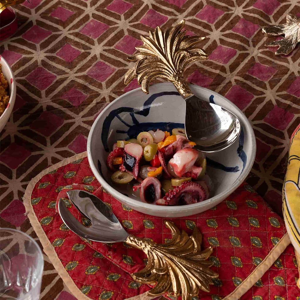 Use the serving set to plate leafy greens and potato salad. With their palm-inspired handles, they’re ideal for outdoor dining. Place them beside salad bowls at buffets and barbecues.