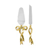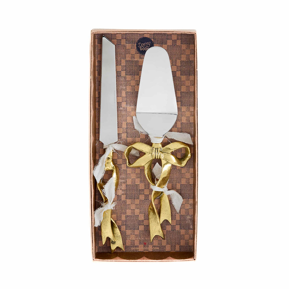 The set includes a cake server and serrated knife. The stainless steel blade glides effortlessly through cakes and pastries. Use the wide, flat server to transfer your slice to a plate.
