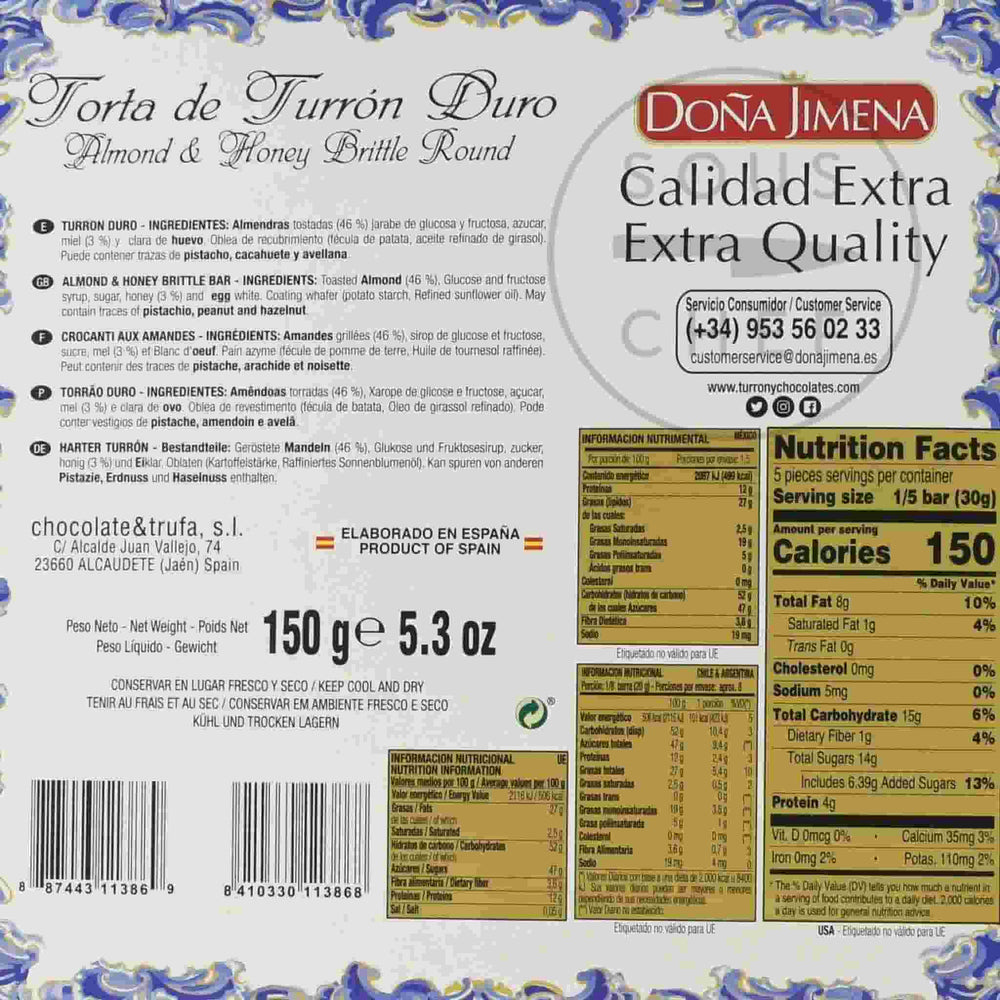 Torta de Turron is a round flat ‘cake’ made with a mixture of Marcona almonds and honey. An egg white wafer holds the mixture together to form a round cake shape. Popular in Andalucia, this crunchy sweet treat is a perfect gift for almond lovers. The honey adds subtle sweetness and the almonds are left whole for an irresistibly crunchy texture.