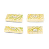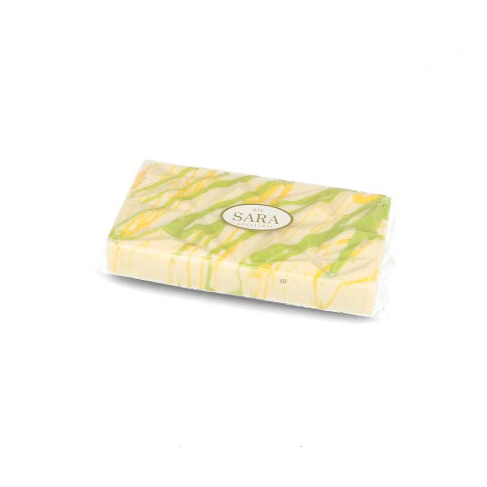 The bar is drizzled with white chocolate in shades of green and yellow. This decorative finishing touch gives it a unique, modern look.