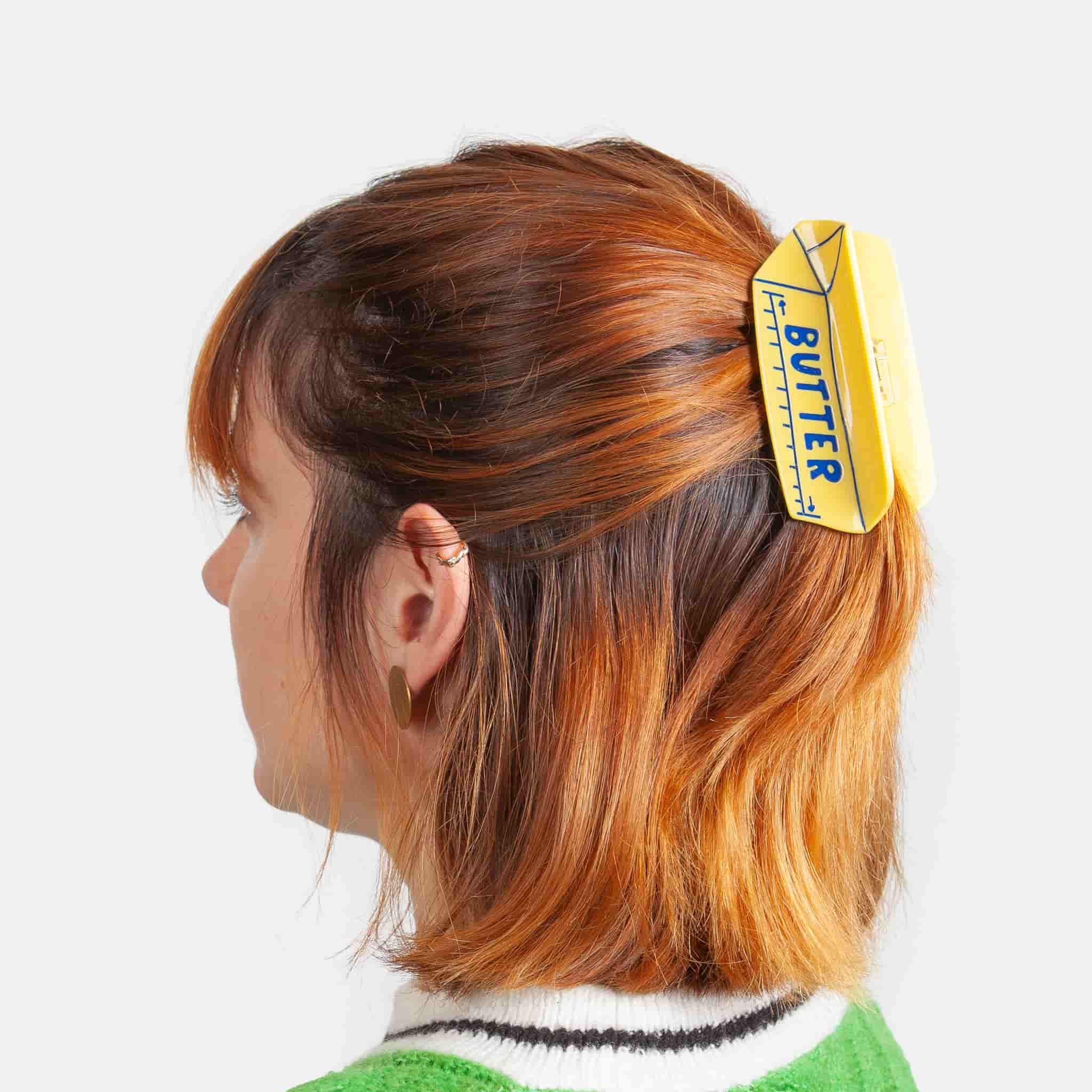 Pin back your hair with this adorable butter claw clip. It’s designed to look like a stick of butter in retro yellow packaging. Use it to keep your hair out of your face while you’re cooking or baking.