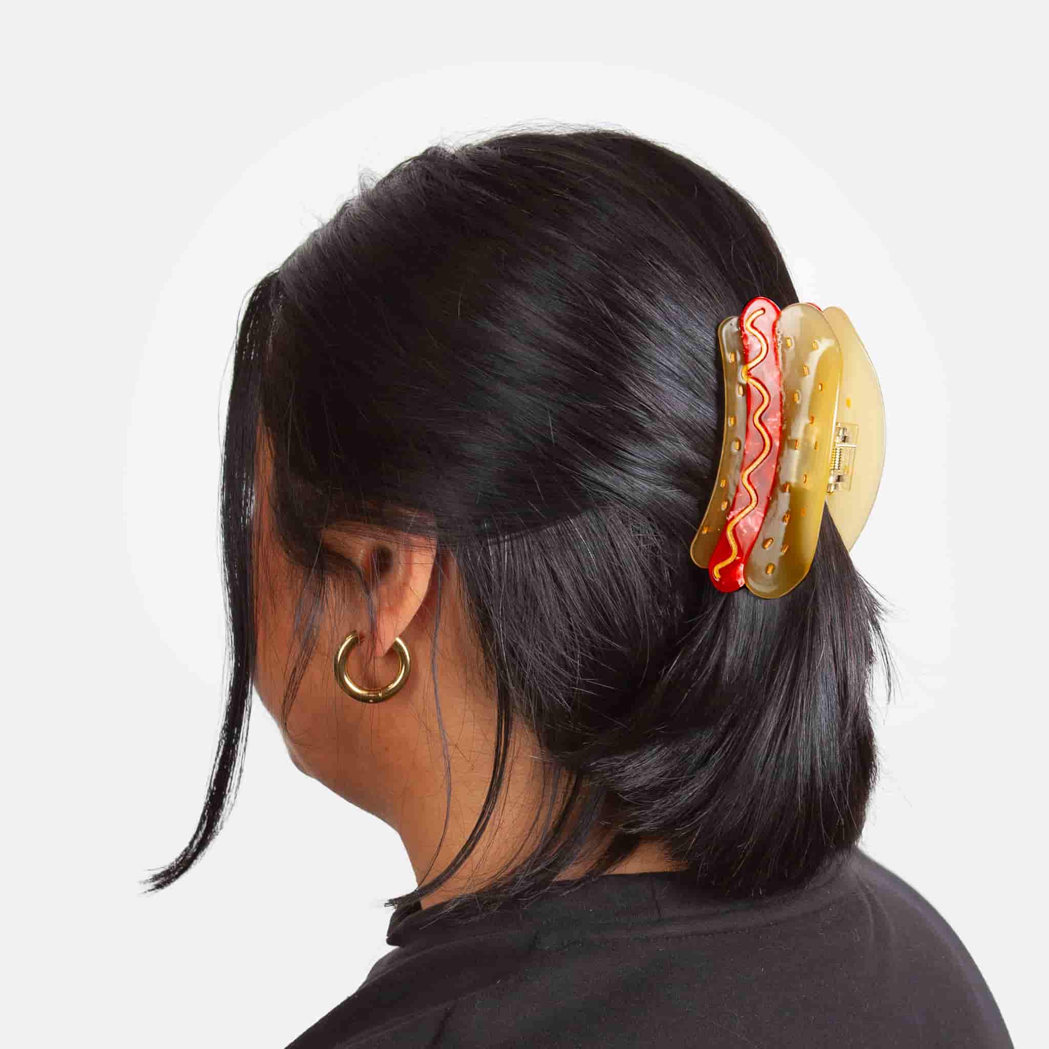 Pin back your hair with this hotdog claw clip. With its golden bun and drizzle of mustard, it looks just like the real thing. Use it to style your hair in a bun or half ponytail. The fun hotdog design is sure to be a talking point at parties and barbecues.