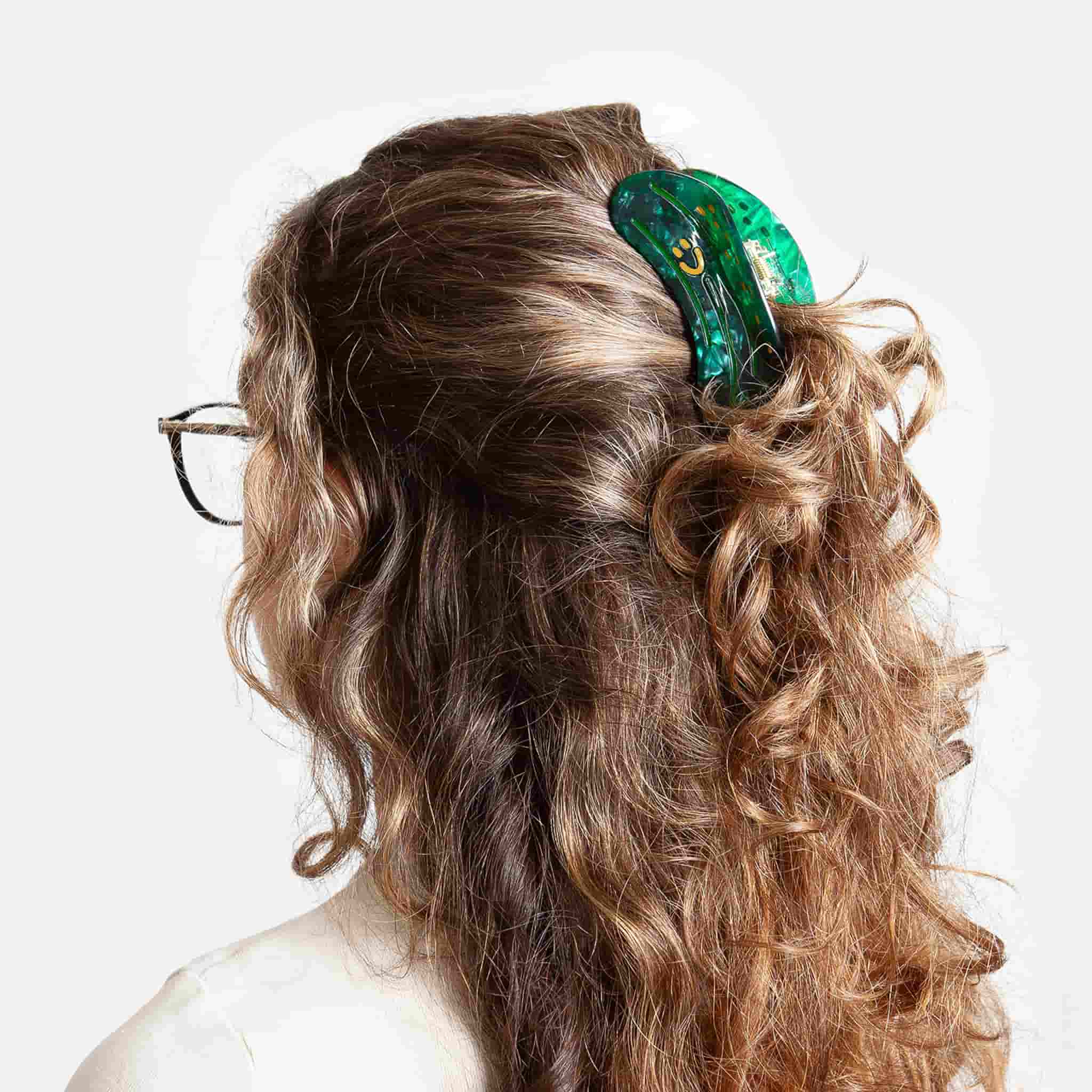 This hair accessory is inspired by tangy, crunchy pickles. Use it to style your hair in a bun or half ponytail. From a distance, it looks like a classic claw clip. Up close, any foodie will spot its pickle-like shape and colour. Flecks of gold shimmer against the deep green background.