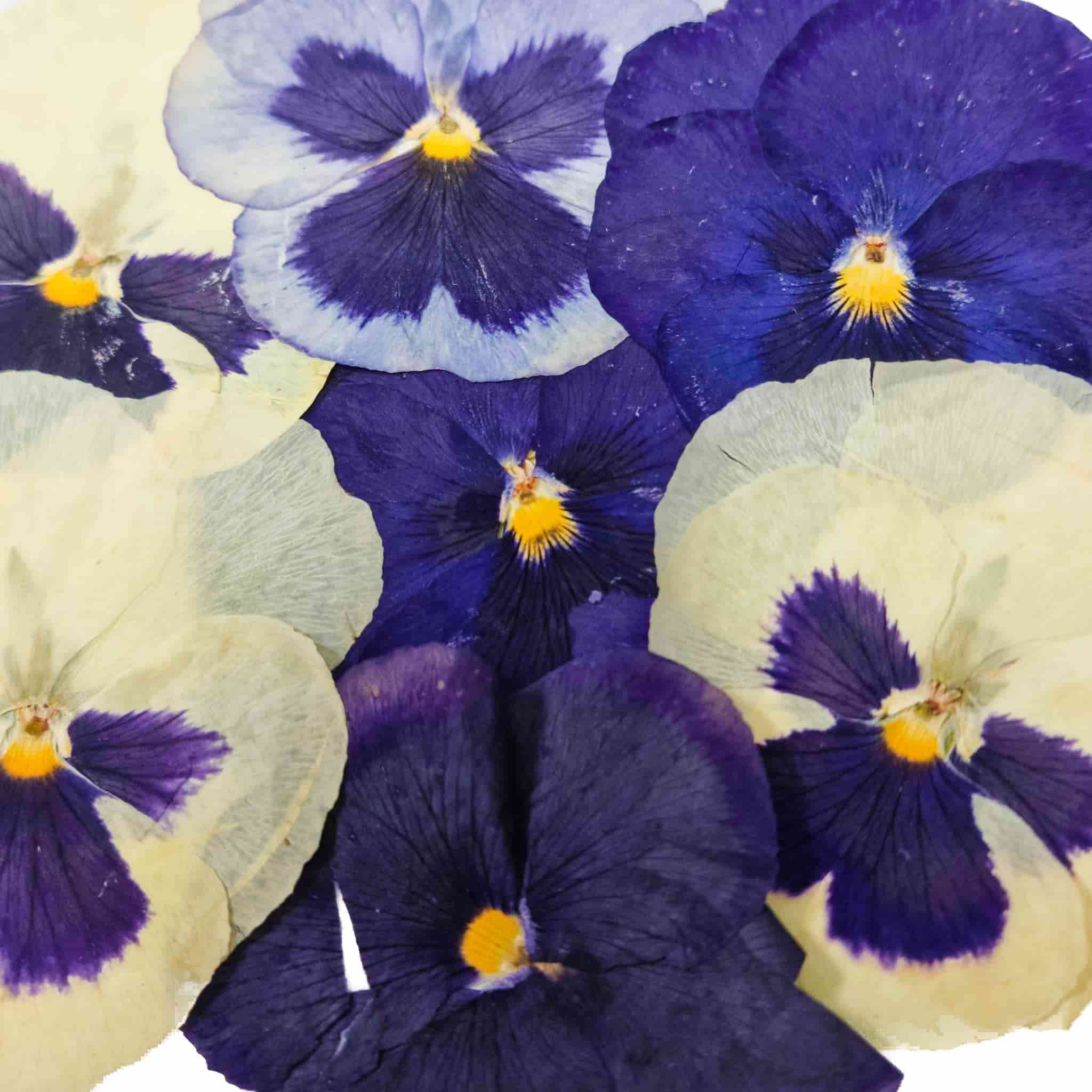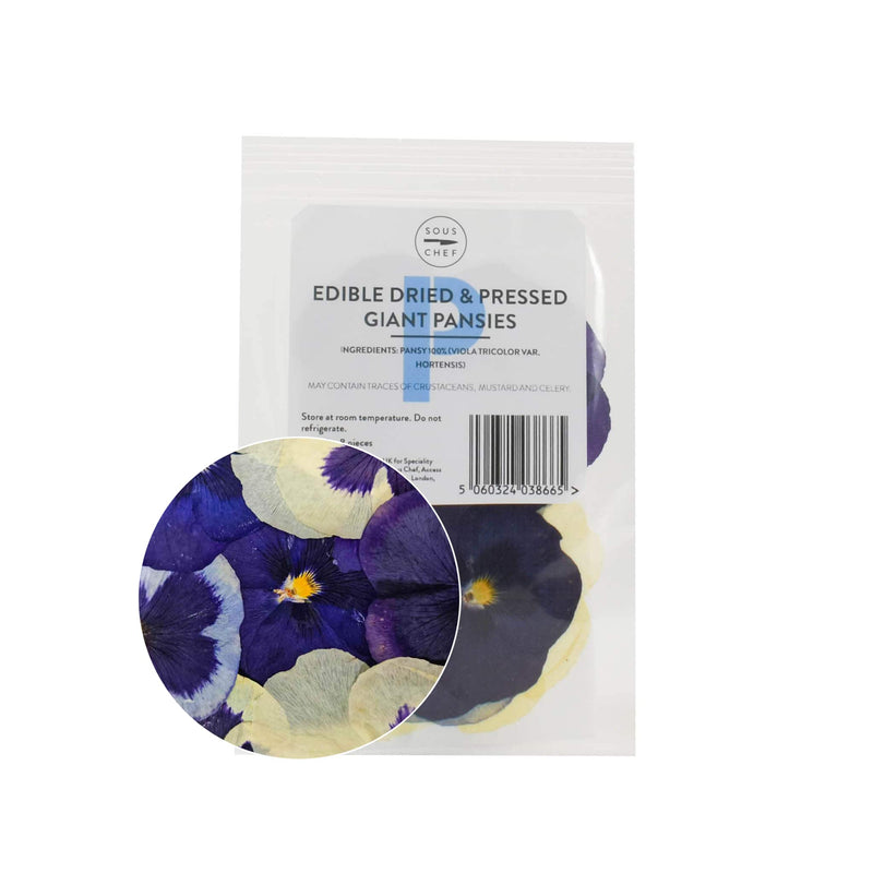 Use these edible dried pressed giant pansies to decorate wedding cakes. Or top cream cheese icing on carrot cake. The wafer thin flowers are pressed whole and measure roughly 6cm. The flowers are a delicate cream colour and deep indigo.