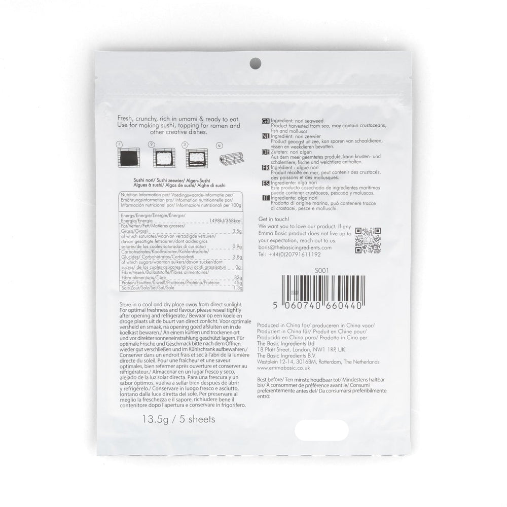 Emma Basic nori is made from seaweed harvested at the beginning of the season. This ensures the texture is not too chewy. The sheets are manufactured in Japan.