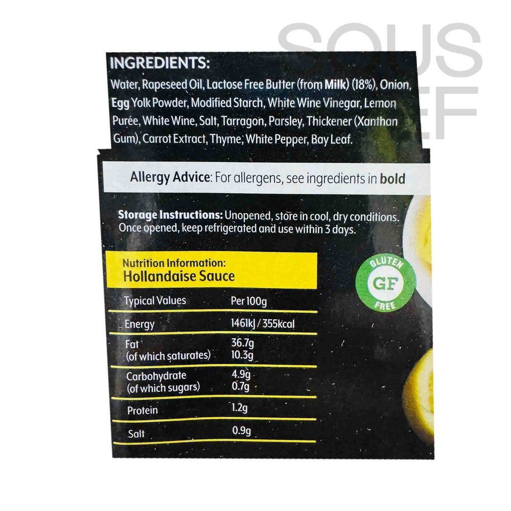 Product formulations and details may change. For the latest ingredients and allergen information always check product packaging prior to consumption. Ingredients: water, rapeseed oil, lactose free butter (from milk)(18%), onion, egg yolk powder, modified starch, white wine vinegar, lemon puree, white wine, salt, tarragon, parsley, thickener (xanthan gum), carrot extract, thyme, white pepper, bay leaf.