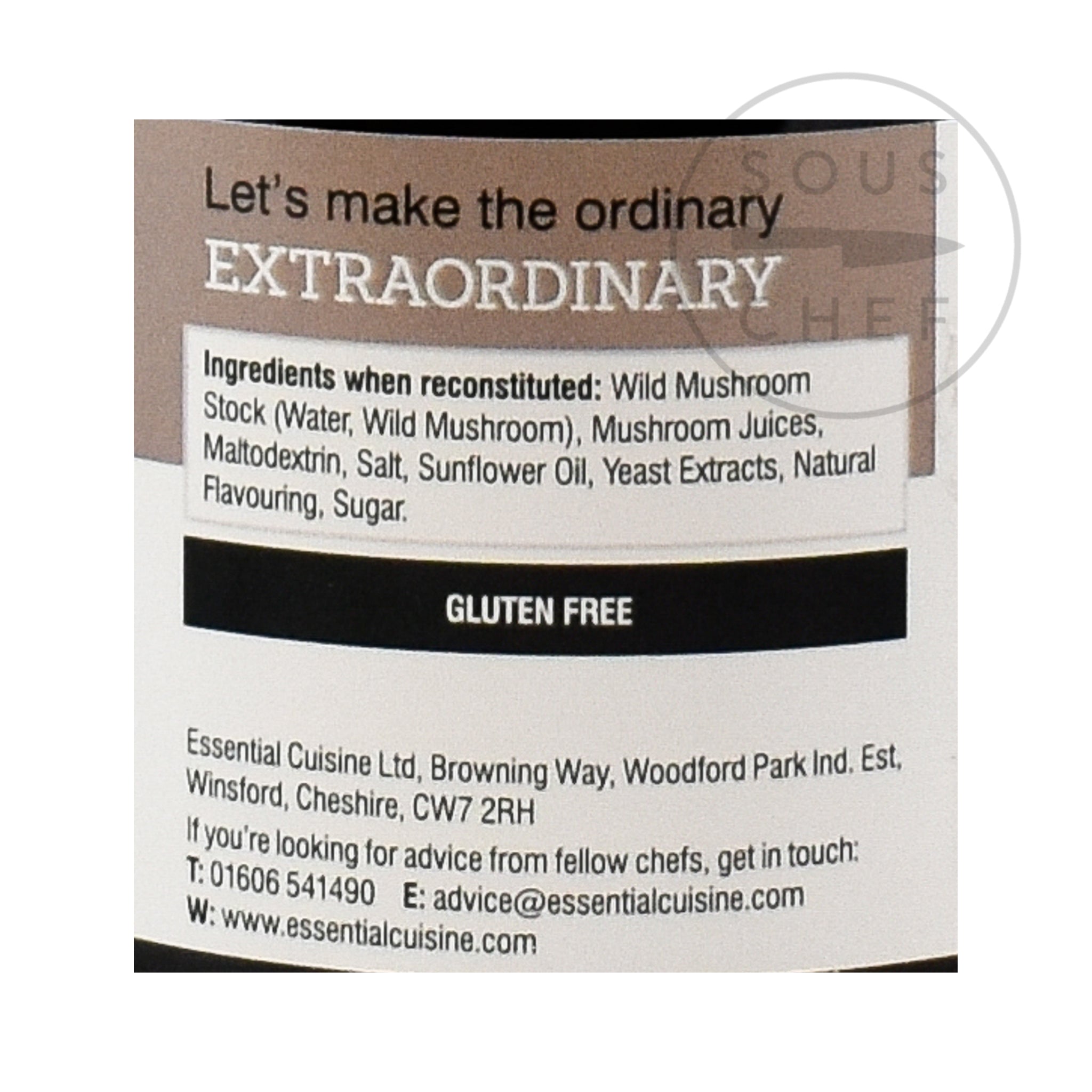 Essential Cuisine wild mushroom glace adds fabulous depth of flavour to your dishes in seconds. The heavily reduced richly flavoured mushroom stock is a magical storecupboard ingredient. Give your sauces and marinades tremendous richness and a great hit of flavour. The mushroom glace has been developed by chefs for chefs.