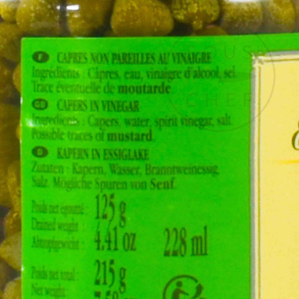 Product formulations and details may change. For the latest ingredients and allergen information always check product packaging prior to consumption. Ingredients: Capers, water, vinegar, salt. Possible traces of mustard.