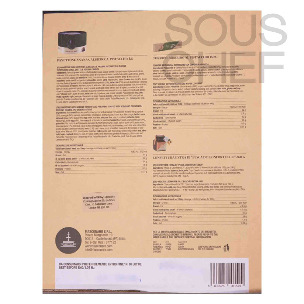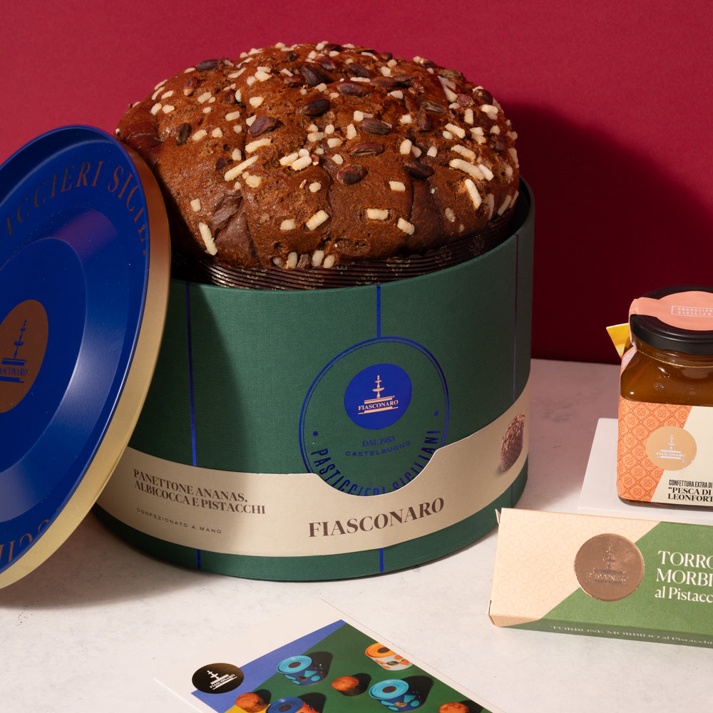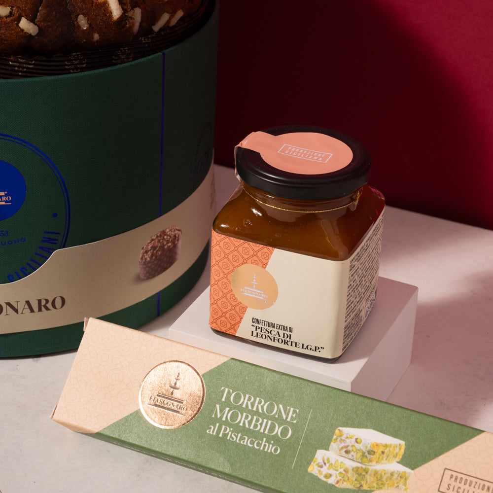Size: Includes: Pineapple, Apricot & Pistachio Panettone 1kg, Soft Pistachio Nougat 150g, Pesca di Leonforte PGI Peach Jam 360g