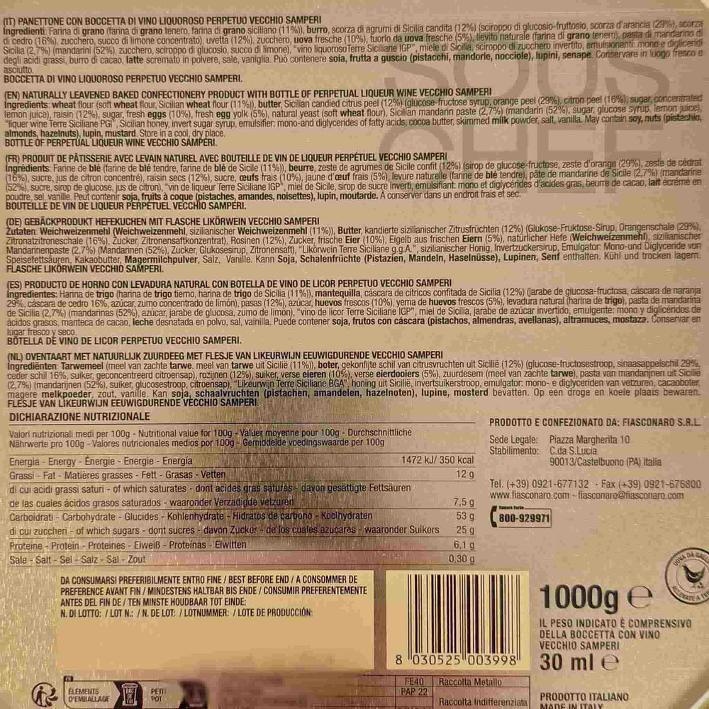 Product formulations and details may change. For the latest ingredients and allergen information always check product packaging prior to consumption. Ingredients: Wheat flour (soft wheat flour, sicilian wheat flour (11%)), butter, sicilian candied citrus peel (12%) (glucose-fructose syrup, orange peel (29%), citron peel (16%), sugar, concentrated lemon juice), raisin (12%), sugar, fresh eggs (10%), fresh egg yolk (5%), natural yeast (soft wheat flour, yeast), sicilian mandarin paste (3%) (mandarin (52%), sugar, glucose syrup, lemon juice), “liqueur wine terre siciliane pgi”, sicilian honey, invert sugar syrup, emulsifier: mono-and diglycerides of fatty acids; cocoa butter, skimmed milk powder, salt, vanilla, flavourings.