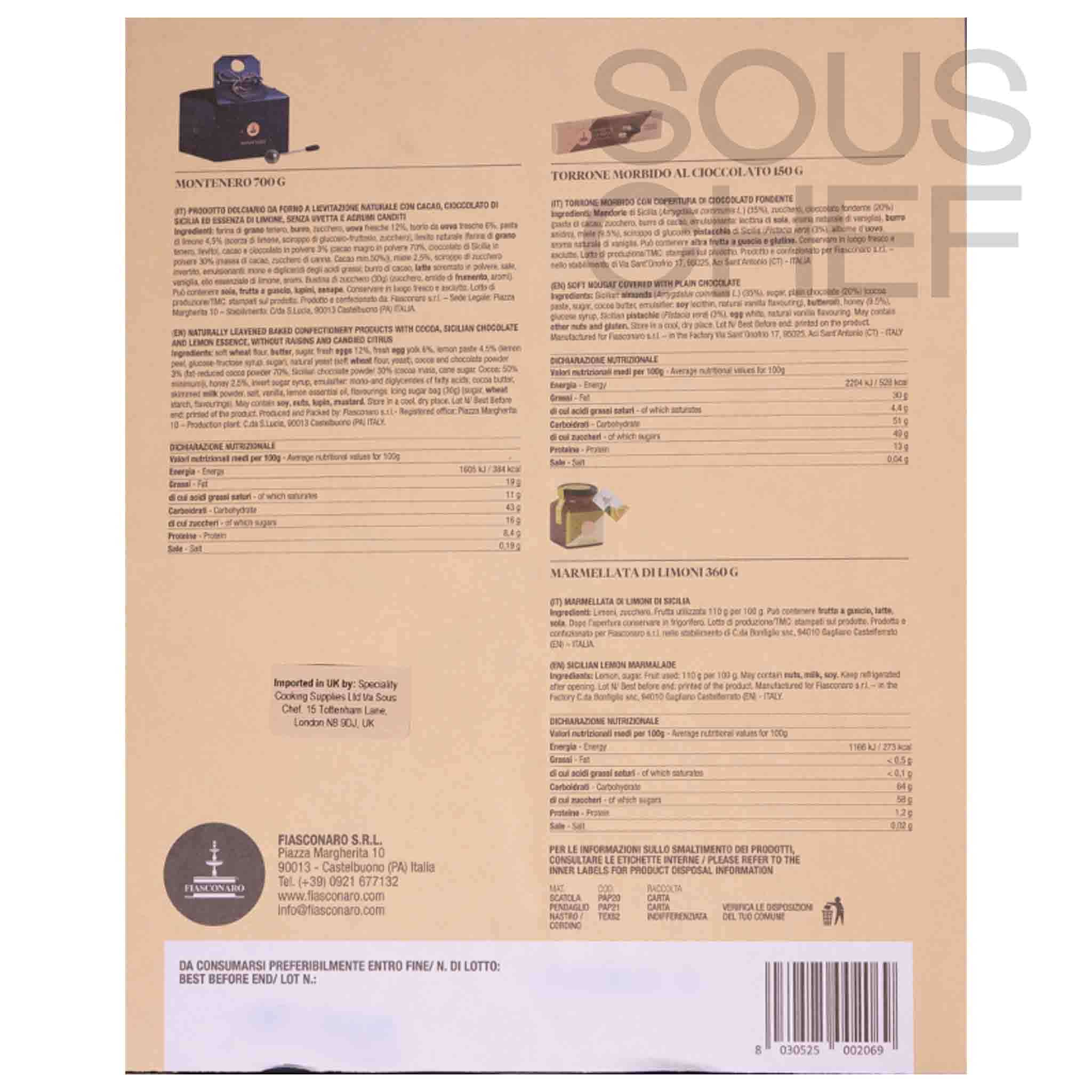 Product formulations and details may change. For the latest ingredients and allergen information always check product packaging prior to consumption. Ingredients: Montenero cake: soft wheat flour, butter, sugar, fresh eggs 12%, fresh egg yolk 6%, lemon paste 4,5% (lemon peel, glucose-fructose syrup, sugar), natural yeast (soft wheat flour,yeast), cocoa and chocolate powder 3% (fat-reduced cocoa powder 70%, sicilian chocolate powder 30% (cocoa mass, cane sugar.cocoa: 50% minimum)), honey 2,5%, invert sugar syrup, emulsifier: mono-and diglycerides of fatty acids; cocoa butter, skimmed milk powder, salt,vanilla, lemon essential oil, flavourings. icing sugar bag (30g) (sugar, wheat starch, flavourings). nougat with almonds: sicilian almonds (amygdalus communis l.) (35%), sugar, plain chocolate (20%) (cocoa paste, sugar, cocoa butter, emulsifier: soy lecithin, natural vanilla flavouring), butter oil), honey (9,5%), glucose syrup, sicilian pistachio (pistacia vera) (3%), egg white, natural vanilla flavouring. Sicilian lemon marmalade: lemon, sugar.