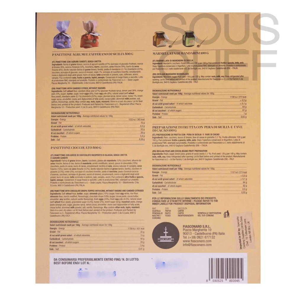 Product formulations and details may change. For the latest ingredients and allergen information always check product packaging prior to consumption. Ingredients: Panettone cake with citrus, without raisins: soft wheat flour, sicilian candied citrus peel (27%) (glucose-fructose syrup, lemon peel 26%, orange peel 22%, sugar), butter, sugar, fresh barn eggs, fresh barn egg yolk, natural yeast (soft wheat flour, yeast), sicilian mandarin paste (2,1%) (mandarin (52%), sugar, glucose syrup, lemon juice), sicilian honey, invert sugar syrup, emulsifier: mono-and diglycerides of fatty acids; cocoa butter, skimmed milk powder, salt, sicilian saffron, flavorings, vanilla. panettone with chocolate drops topped with icing, without raisins and candied citrus: soft wheat flour, butter, sugar, almonds glaze (10%) (sugar, fresh barn egg white, rice flour, almonds flour, starch modified, flavourings), chocolate drops (10%) (sugar, cocoa paste, cocoa butter, emulsifier soy lecithin, natural vanilla flavouring), fresh barn eggs, fresh barn egg yolk, natural yeast (soft wheat flour, yeast), granulated sugar (3,5%), sicilian honey, invert sugar syrup, hazelnut paste, orange paste (orange peel, sugar, glucose syrup, lemon juice), emulsifier: mono-and diglycerides of fatty acids; cocoa butter, skim milk powder, salt, vanilla, flavourings. sicilian mandarin marmalade: mandarin, sugar. sicilian pear and cocoa beans fruits preparation: pears, sugar, lemon juice, grains of cocoa benas (1,1%).