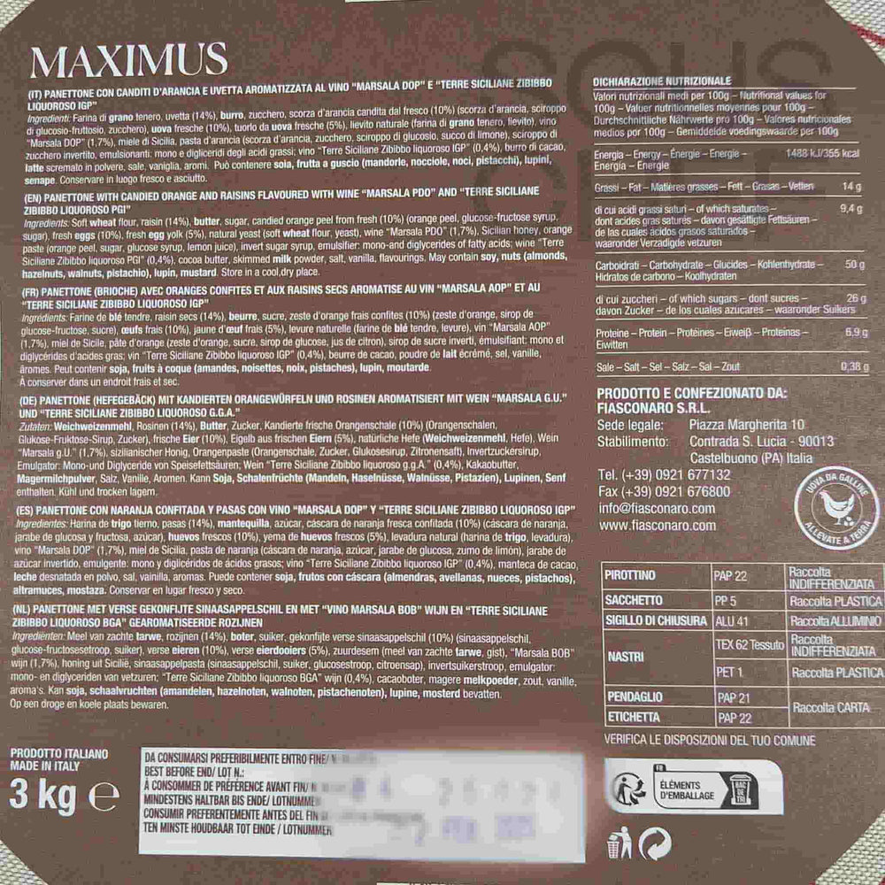 Product formulations and details may change. For the latest ingredients and allergen information always check product packaging prior to consumption. Ingredients: Soft wheat flour, raisin (14%), butter, sugar, candied orange peel from fresh (10%) (orange peel, glucose-fructose syrup, sugar), fresh barn eggs, fresh barn egg yolk, natural yeast (soft wheat flour, yeast), wine “marsala PDO” (1,7%), Sicilian honey, orange paste (orange peel, sugar, glucose syrup, lemon juice), invert sugar syrup, emulsifier: mono‐and diglycerides of fatty acids, “Terre Siciliane zibibbo liquoroso pgi” (0,4%), cocoa butter, skimmed milk powder, salt, vanilla, flavourings.