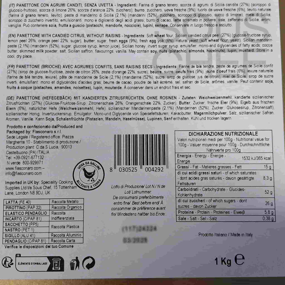 Product formulations and details may change. For the latest ingredients and allergen information always check product packaging prior to consumption. Ingredients: Soft wheat flour, Sicilian candied citrus peel (27%) (glucose-fructose syrup, lemon peel (26%), orange peel (22%), sugar), butter, sugar, fresh eggs, fresh egg yolk, natural yeast (wheat flour, water, yeast), Sicilian mandarin paste (2.1%) (mandarin (52%), sugar, glucose syrup, lemon juice), Sicilian honey, invert sugar syrup, emulsifier: mono-and diglycerides of fatty acids, cocoa butter, powdered skimmed milk powder, salt, Sicilian saffron, natural vanilla flavouring, natural saffron flavouring.