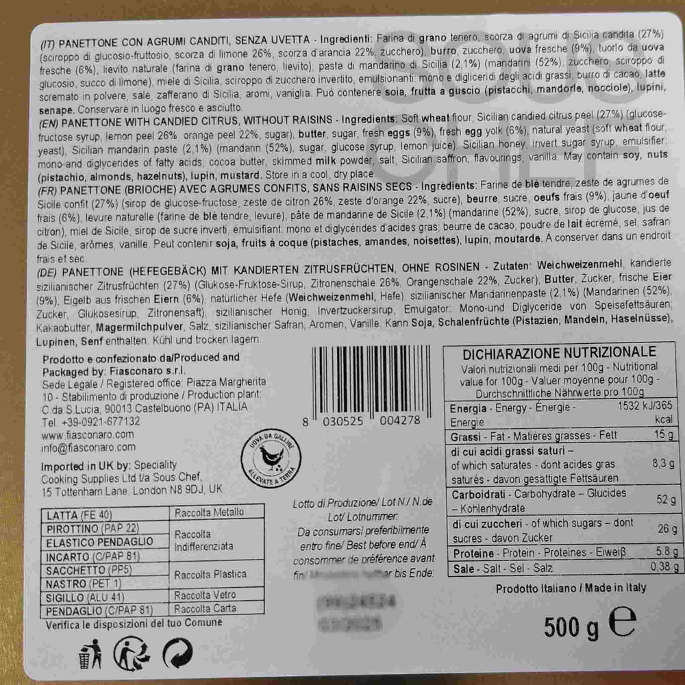 Product formulations and details may change. For the latest ingredients and allergen information always check product packaging prior to consumption. Ingredients: Soft wheat flour, Sicilian candied citrus peel (27%) (glucose-fructose syrup, lemon peel 26%, orange peel 22%, sugar), butter, sugar, fresh eggs, fresh egg yolk, natural yeast (soft wheat flour, yeast), Sicilian mandarin paste (2,1%) (mandarin (52%), sugar, glucose syrup, lemon juice), Sicilian honey, invert sugar syrup, emulsifier: mono-and diglycerides of fatty acids, cocoa butter, skimmed milk powder, salt, Sicilian saffron, vanilla, natural saffron flavouring.