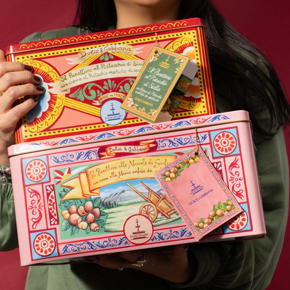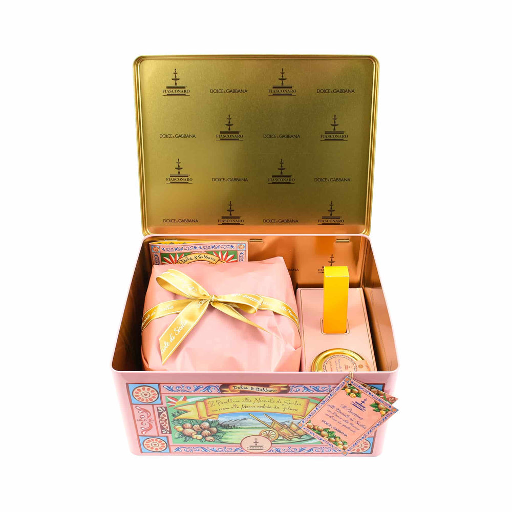 The Fiasconaro x Dolce & Gabbana hazelnut panettone with manna cream comes in a stunning illustrated pink tin. It’s a wonderful gift for friends and family, or a treat for yourself. Manna is a natural syrup, harvested from the ash trees of Sicily. It is used here to sweeten the golden panettone dough, along with Sicilian honey.