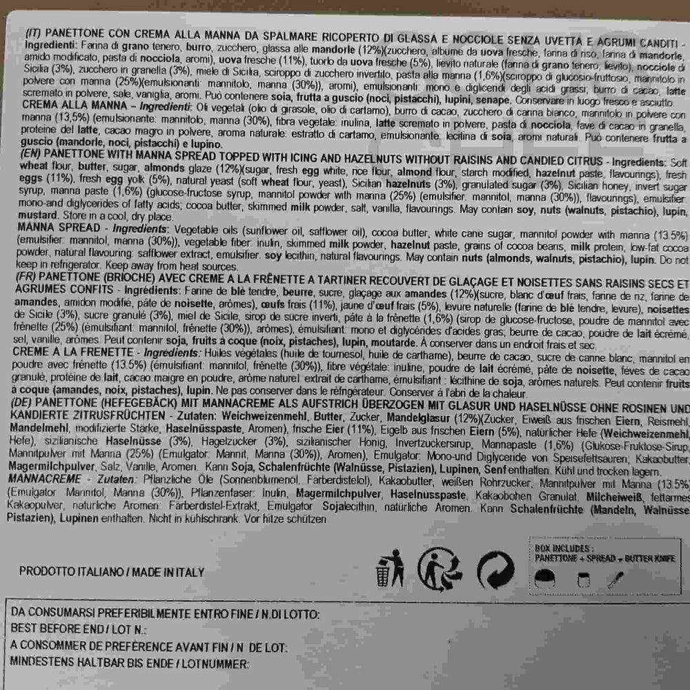 Product formulations and details may change. For the latest ingredients and allergen information always check product packaging prior to consumption. Ingredients: Soft wheat flour, butter, almonds glaze (12%)(fresh barn egg white, sugar, rice flour, almond flour, starch modified, hazelnut paste, flavourings), fresh eggs, Sicilian hazelnuts (Corylus Avellana)(3%), fresh egg yolk, natural yeast (wheat flour, yeast), granulated sugar (3%), manna paste (1.6%) (glucose-fructose syrup, powdered purified manna (25%) (mannitol, manna (30%)), flavourings), Sicilian honey, Invert sugar syrup, emulsifier: mono-and diglycerides of fatty acids, cocoa butter, powdered skimmed milk, salt, vanilla, flavourings.