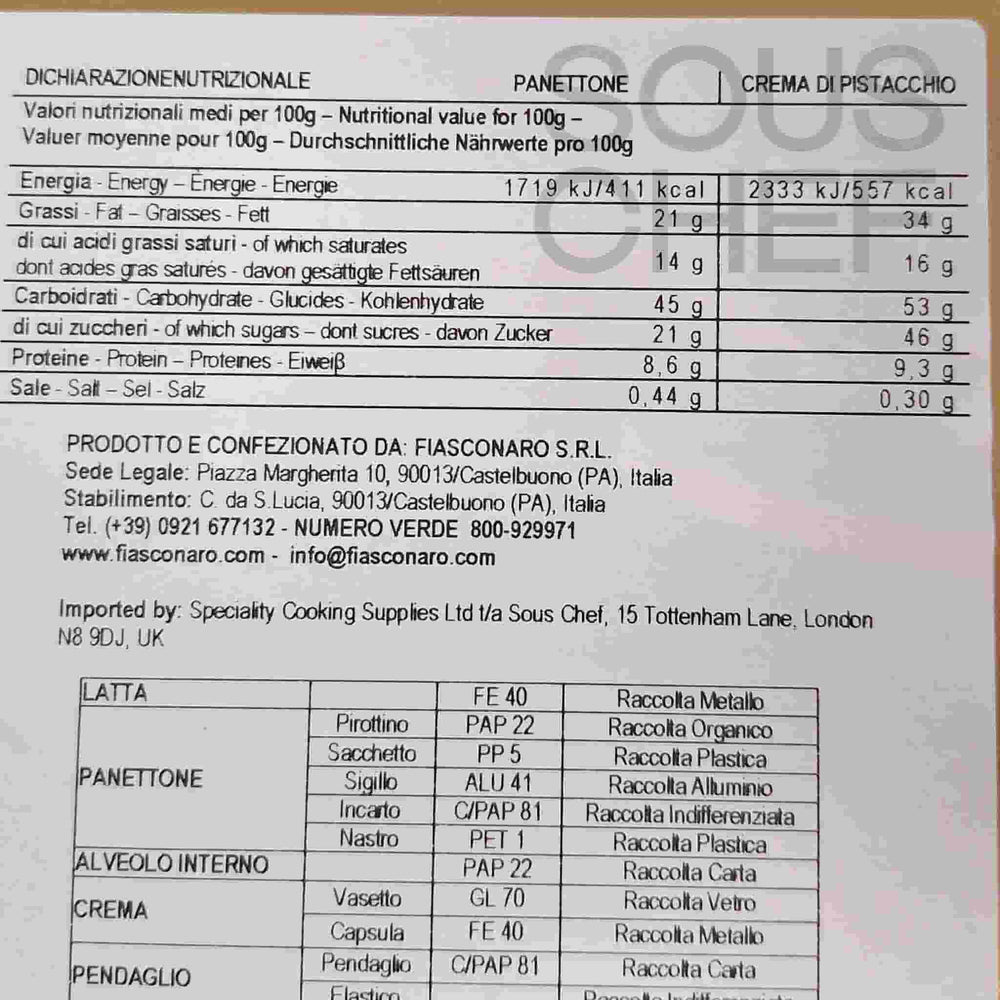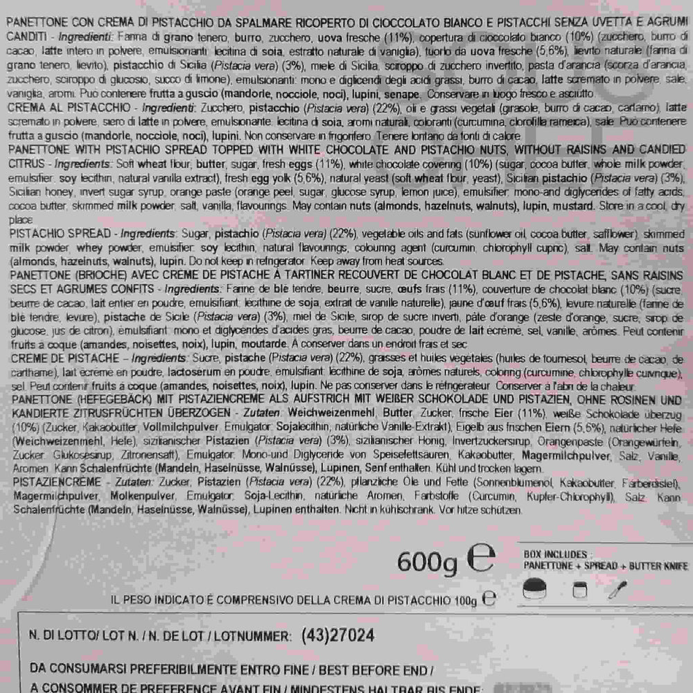 Product formulations and details may change. For the latest ingredients and allergen information always check product packaging prior to consumption. Ingredients: Soft wheat flour, butter, sugar, fresh eggs, white chocolate covering (10%) (sugar, whole powdered milk, cocoa butter, emulsifier: soy lecithin, natural vanilla extract), fresh barn egg yolk, natural yeast (soft wheat flour, yeast), Sicilian pistachio (Pistacia vera) (3%), Sicilian honey, invert sugar syrup, orange paste (orange peel, sugar, glucose syrup, lemon juice), emulsifier: mono-and diglycerides of fatty acids, cocoa butter, powdered skimmed milk, salt, vanilla flavouring.