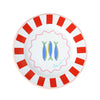 The plate has a red striped rim and squiggly pink border. In the centre is a blue and green fish motif.