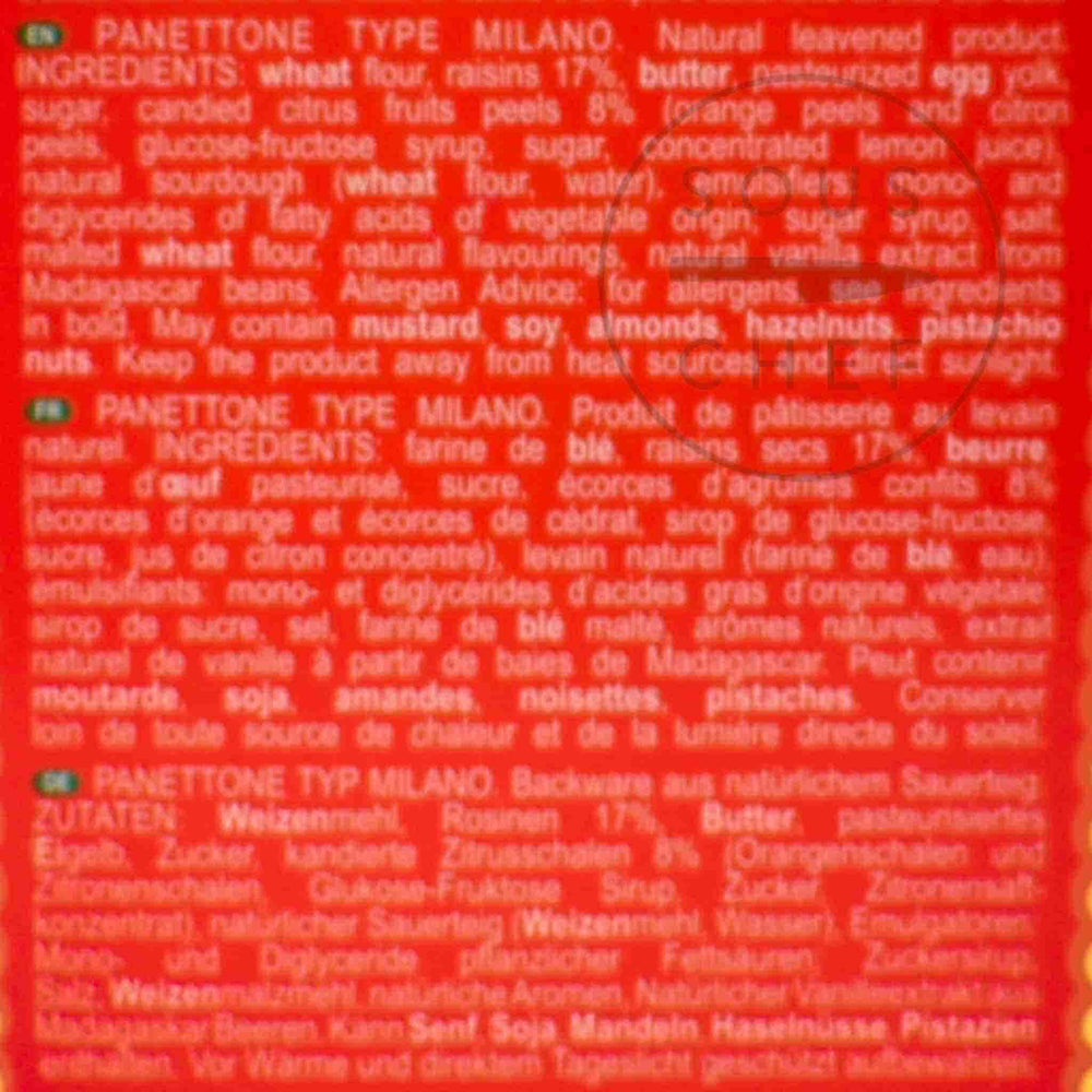 Product formulations and details may change. For the latest ingredients and allergen information always check product packaging prior to consumption. Ingredients: Wheat flour, raisins 19%, butter, pasteurised egg yolk, sugar, candied citrus fruits peels 8% (candied orange peels and candied citron peels, glucose-fructose syrup, sugar, concentrated lemon juice), sugar, natural sourdough (wheat flour, water), emulsifiers: mono- and diglycerides of fatty acids; invert sugar syrup, salt, enzymes (contains wheat), natural flavourings (contains milk), malted wheat flour, natural vanilla extract from madagascar beans.