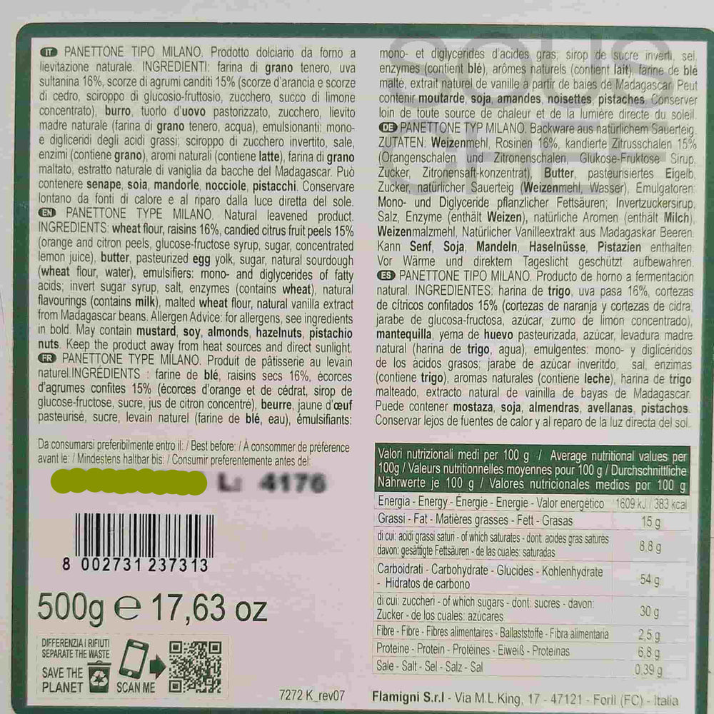 Product formulations and details may change. For the latest ingredients and allergen information always check product packaging prior to consumption. Ingredients: wheat flour, raisins, candied fruit peels (orange peels, citron peels, glucose-fructose syrup, sugar, concentrated lemon juice), butter pasteurized egg yolk, sugar, natural sourdough (wheat flour, water), emulsifiers: mono- and diglycerides of fatty acids, invert sugar syrup, salt, enzymes (contains wheat), malted wheat flour, natural flavourings (contains milk), natural vanilla extract from Madagascar beans.