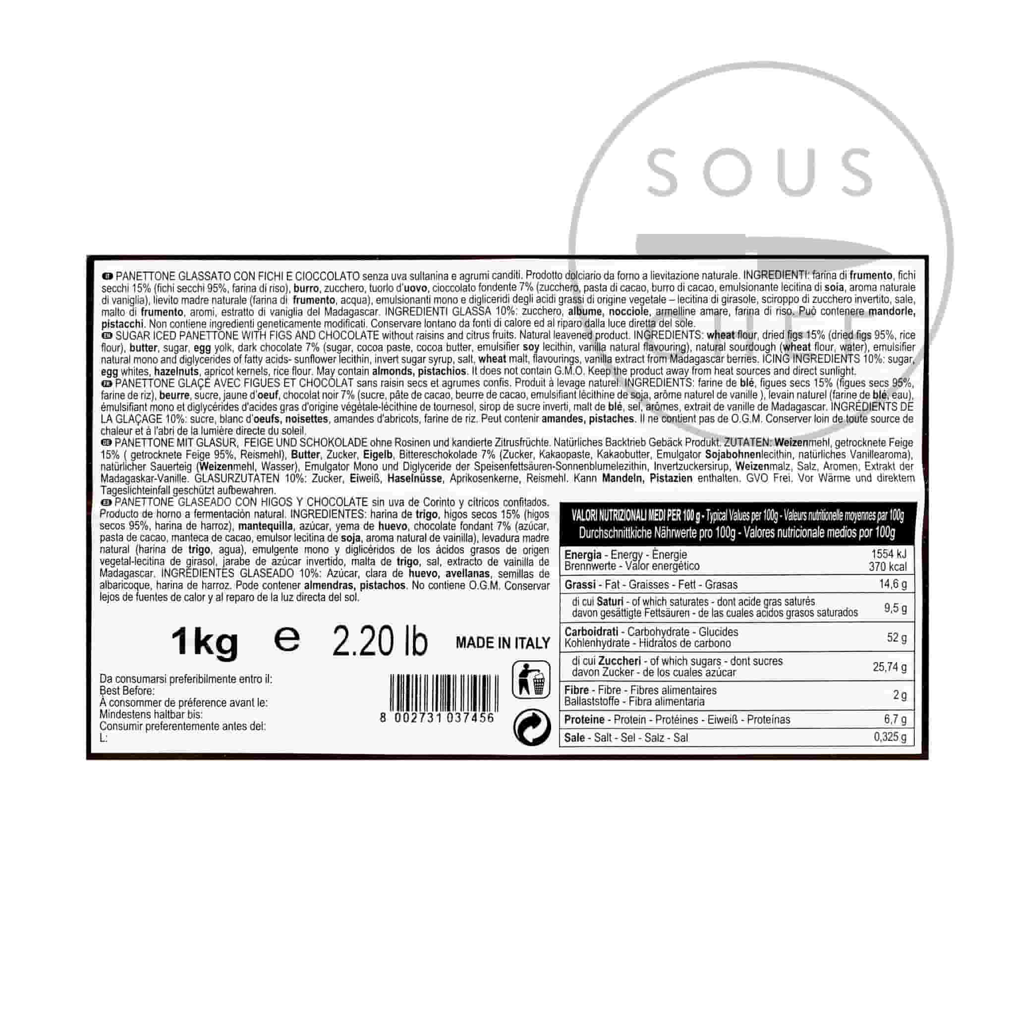 PANETTONE: wheat flour, dried figs 16% (dried figs, rice flour), icing 12% (sugar, pasteurized egg white, hazelnuts grain, peeled bitter apricot kernels flour, rice flour), butter, sugar, pasteurized egg yolk, dark chocolate 7% (sugar, cocoa paste, cocoa butter, emulsifier soy lecithin, natural vanilla flavouring), natural sourdough 6% (wheat flour, water), emulsifier natural mono- and diglycerides of fatty acids, invert sugar syrup, salt, enzymes (contains wheat), malted wheat flour, natural flavourings (contains milk), natural vanilla extract from Madagascar beans.