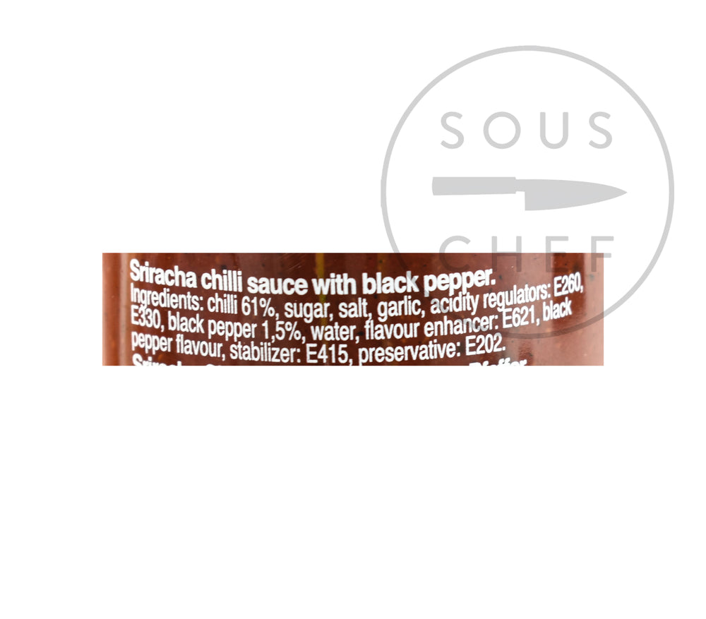 Product formulations and details may change. For the latest ingredients and allergen information always check product packaging prior to consumption. Ingredients: Chilli 61%, sugar, salt, garlic, acidity regulators: E260, E330, black pepper 1.5%, water, flavour enhancer: E621, black pepper flavour, stabiliser: E415, preservative: E202.