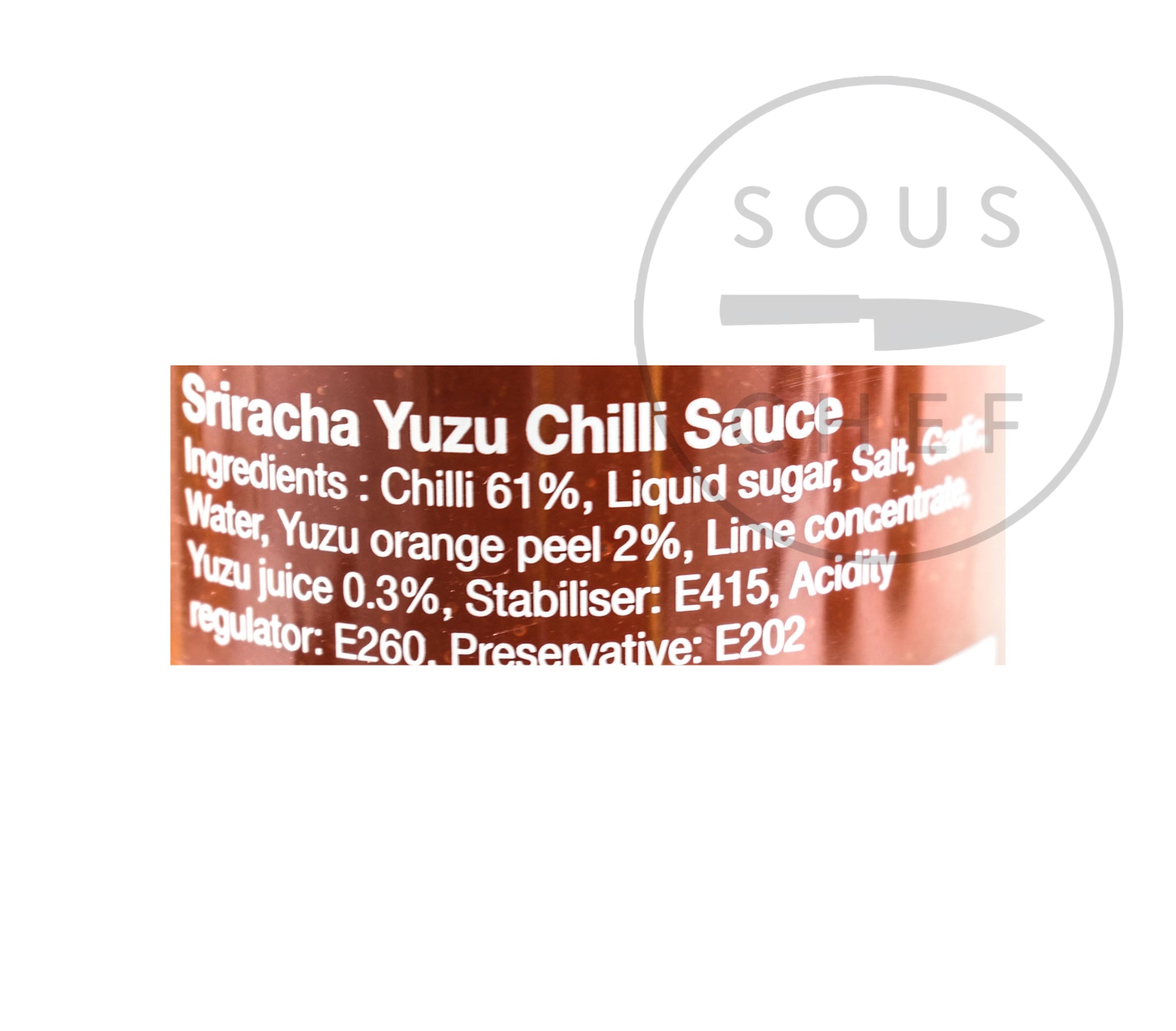 Product formulations and details may change. For the latest ingredients and allergen information always check product packaging prior to consumption. Ingredients: Chilli 61%, liquid sugar, salt, garlic, water, yuzu orange peel 2%, lime concentrate, yuzu juice 0.3%, stabiliser: E415, acidity regulator: E260, preservative: E202.