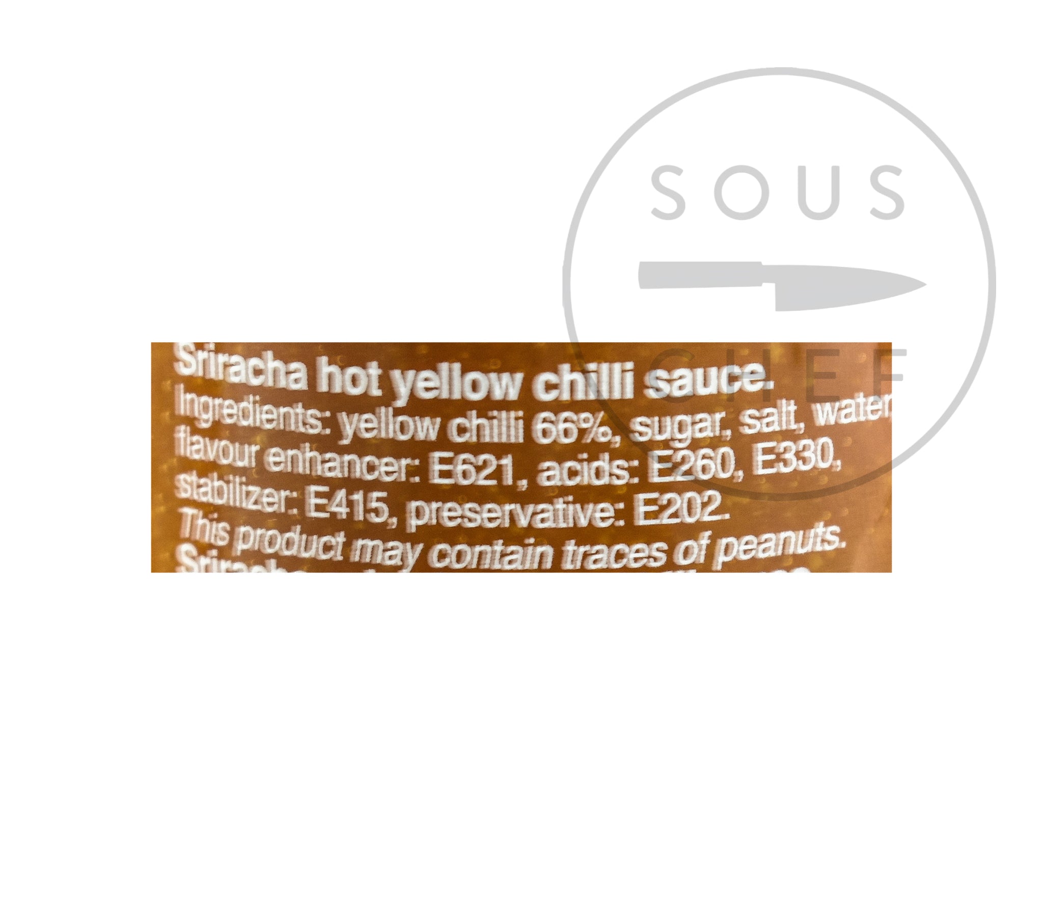 Product formulations and details may change. For the latest ingredients and allergen information always check product packaging prior to consumption. Ingredients: Yellow chilli 66%, sugar, salt, water, flavour enhancer: E621, acids: E260, E330, stabiliser: E415, preservative: E202.