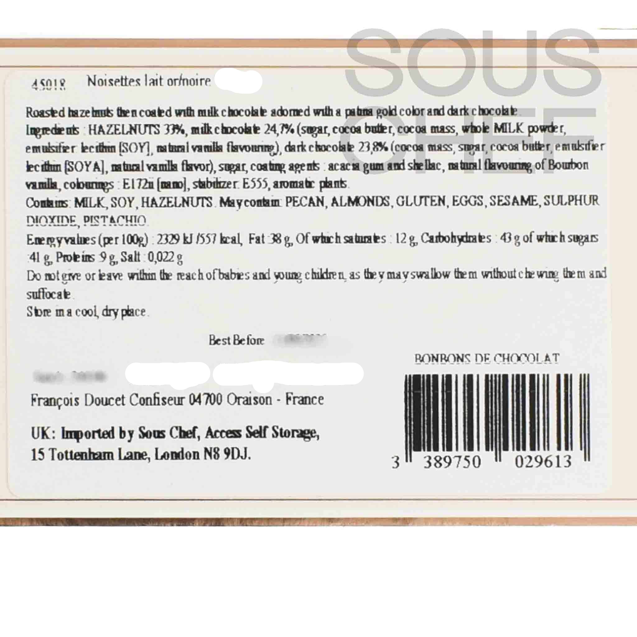 Product formulations and details may change. For the latest ingredients and allergen information always check product packaging prior to consumption. Ingredients: Hazelnuts 33%, milk chocolate 24,7% (sugar, cocoa butter, cocoa mass, whole milk powder, emulsifier: soy lecithin, natural flavour of vanilla), dark chocolate 23,8% (cocoa mass, sugar, cocoa butter, emulsifier: soy lecithin, natural flavour of vanilla), sugar, coating agents: acacia gum and shellac, natural flavouring of Bourbon vanilla, colourings: E172ii [nano], stabiliser: E555, aromatic plants.