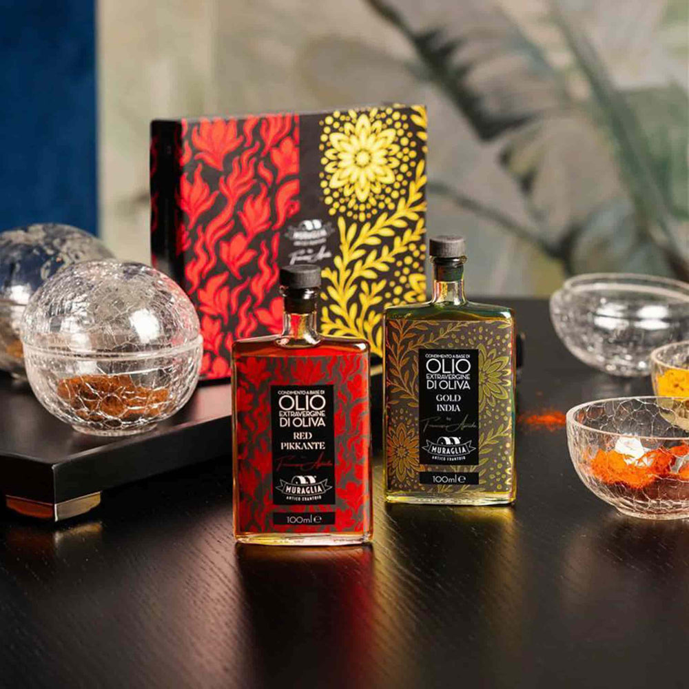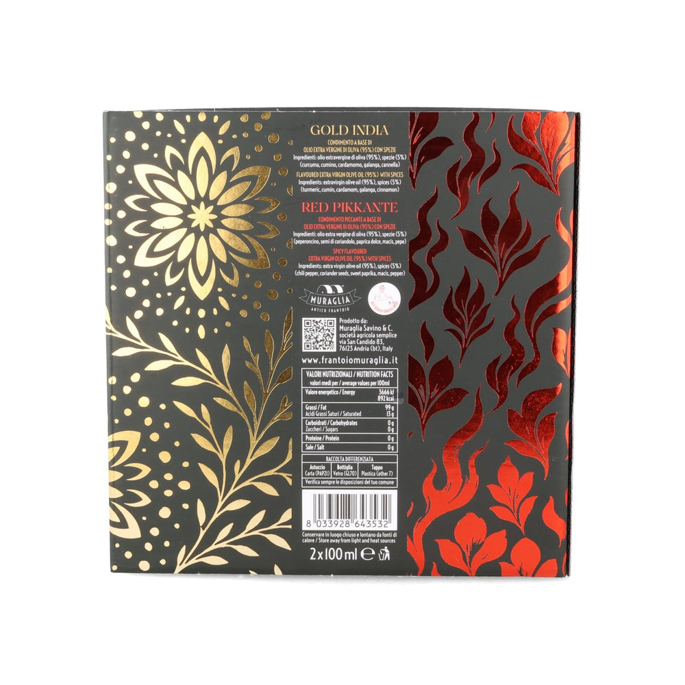 Product formulations and details may change. For the latest ingredients and allergen information always check product packaging prior to consumption. Ingredients: Red pikkante: 95% extra virgin olive oil, spices 5% (chili pepper, coriander seeds, sweet paprika, macis, pepper) - gold India: 95% extra virgin olive oil, spices 5% (turmeric, cumin, cardamom, galanga, cinnamon)