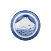 Serve pickles and wasabi on this Japanese small plate. The design features a little dinosaur with Mount Fuji in the background. The plate is made from ceramic and has a thick blue border. Beneath the dinosaur is a traditional Edo pattern.