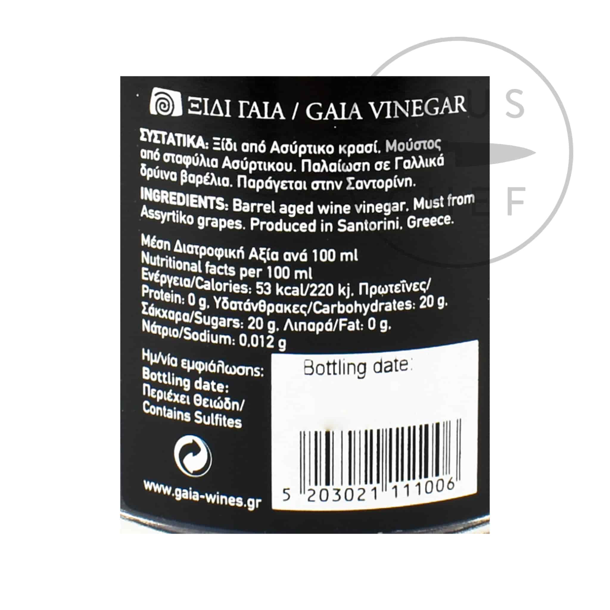 Product formulations and details may change. For the latest ingredients and allergen information always check product packaging prior to consumption. Ingredients: Vinegar from Assyrtiko grapes.
