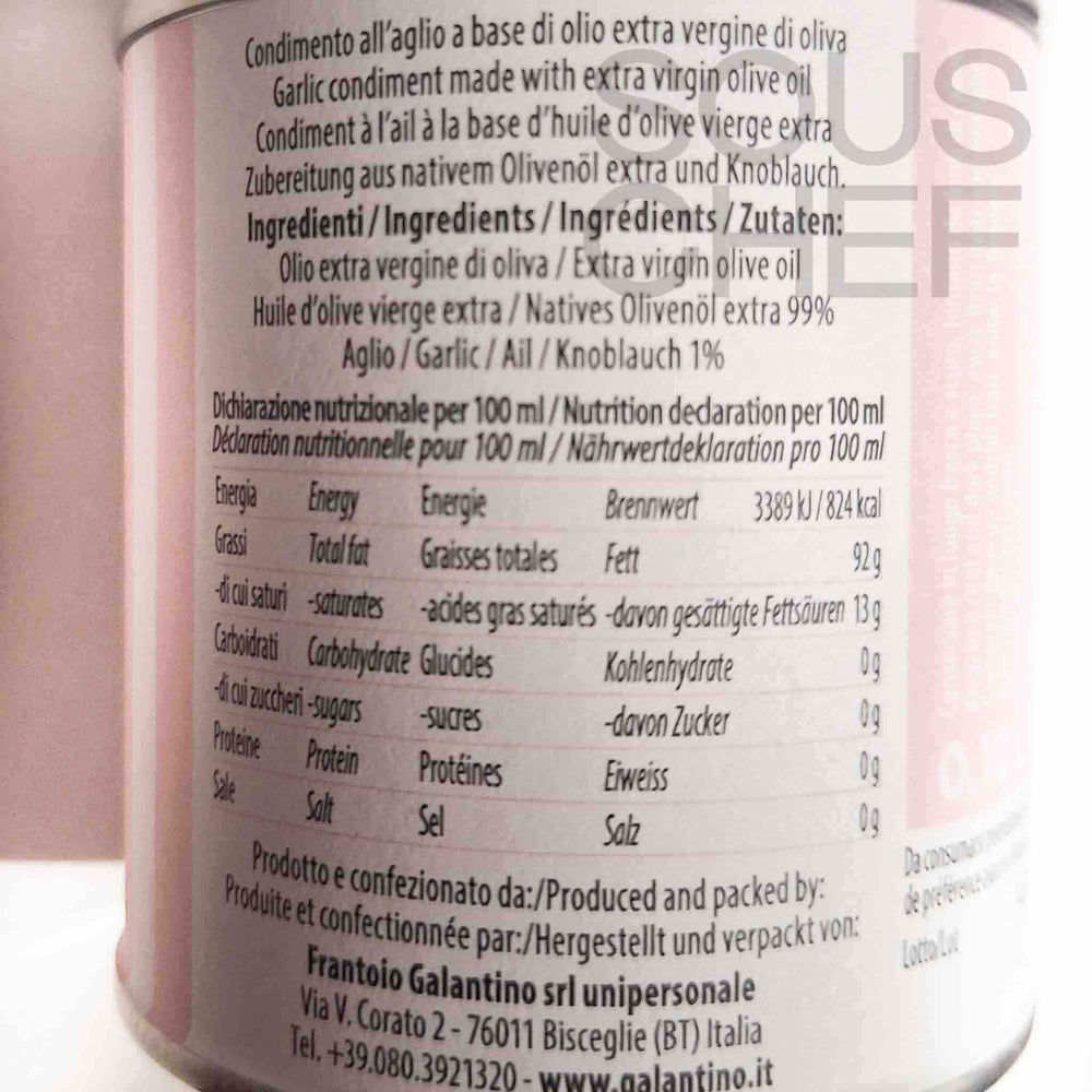 Product formulations and details may change. For the latest ingredients and allergen information always check product packaging prior to consumption. Ingredients: Extra virgin olive oil 99%, garlic 1%