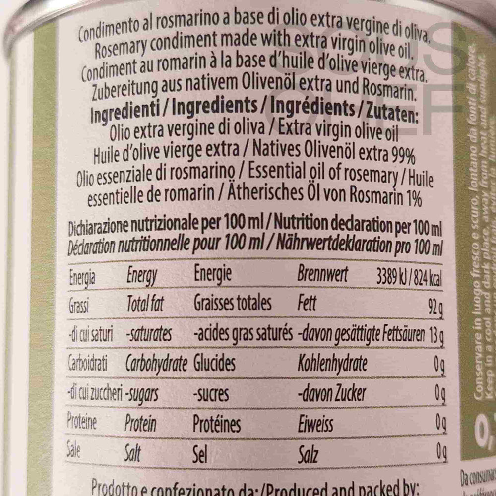 Product formulations and details may change. For the latest ingredients and allergen information always check product packaging prior to consumption. Ingredients: Extra virgin olive oil 99%, rosemary 1%