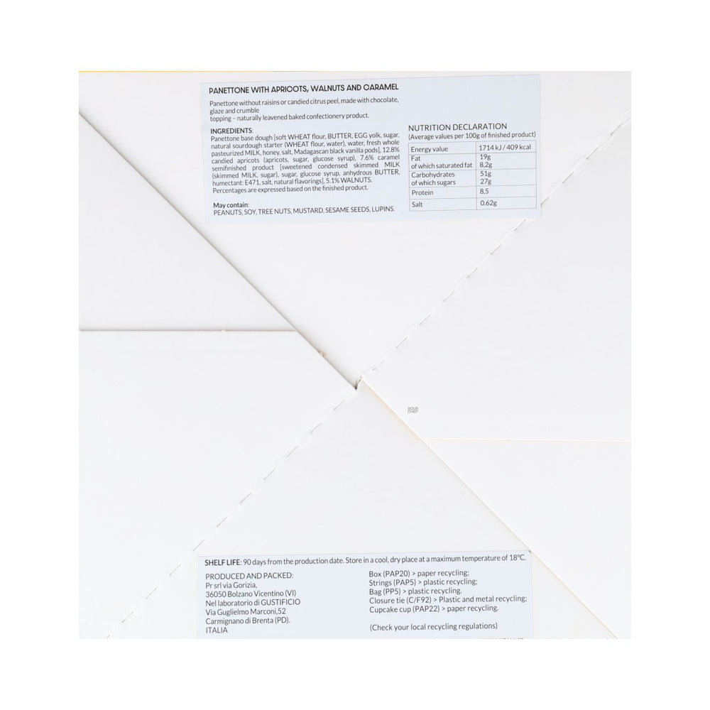 Product formulations and details may change. For the latest ingredients and allergen information always check product packaging prior to consumption. Ingredients: Panettone base dough [soft wheat flour, butter, egg yolk, sugar, natural sourdough starter (wheat flour, water), water, fresh whole pasteurized milk, honey, salt, madagascan black vanilla pods], 12.8% candied apricots (apricots, sugar, glucose syrup), 7.6% caramel semi-finished product [sweetened condensed skimmed milk (skimmed milk, sugar), sugar, glucose syrup, anhydrous butter, humectant: e471, salt, natural flavorings], 5.1% walnuts.