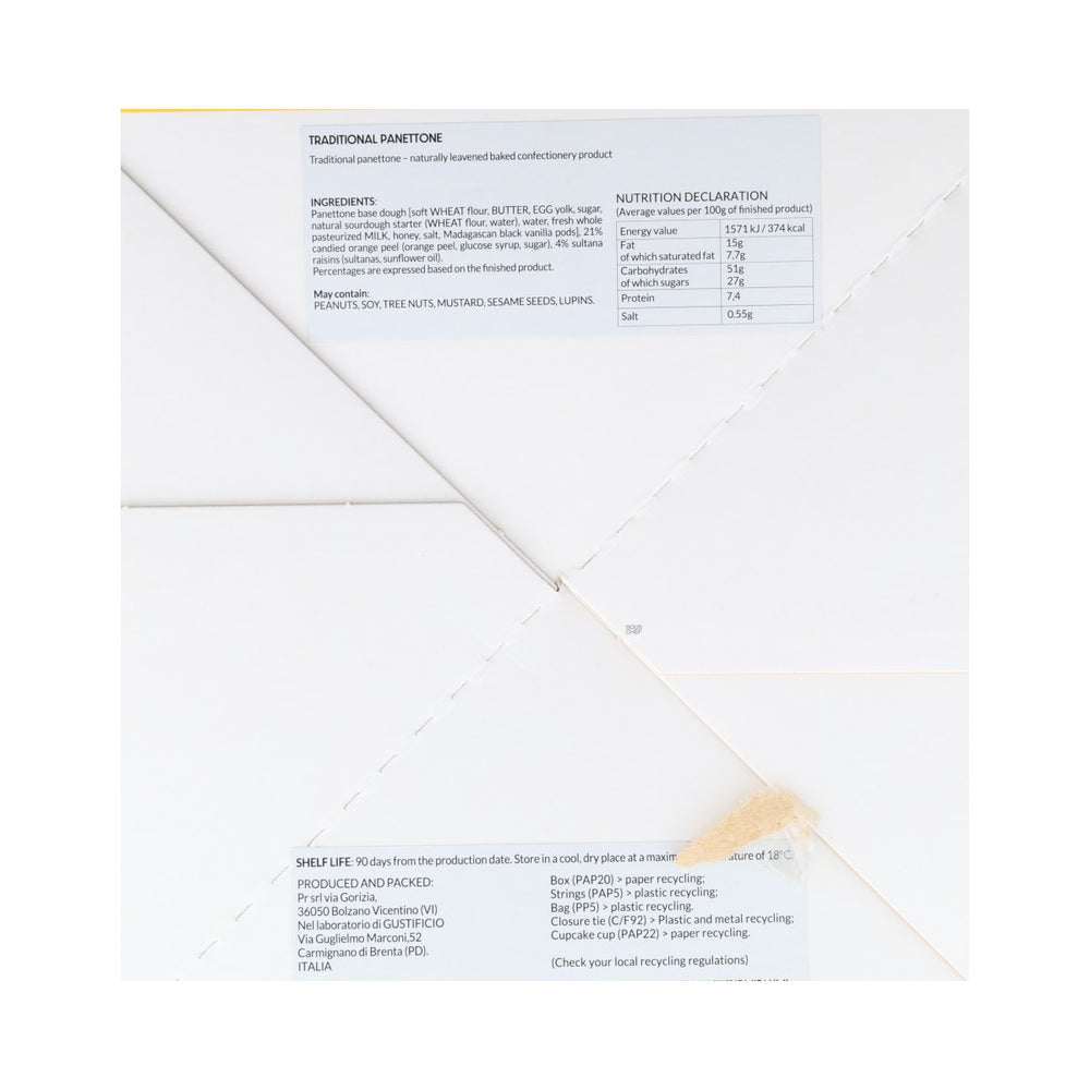 Product formulations and details may change. For the latest ingredients and allergen information always check product packaging prior to consumption. Ingredients: Panettone base dough [soft wheat flour, butter, egg yolk, sugar, natural sourdough starter (wheat flour, water), water, fresh whole pasteurized milk, honey, salt, madagascan black vanilla pods], 21% candied orange peel (orange peel, glucose syrup, sugar), 4% sultana raisins (sultanas, sunflower oil).