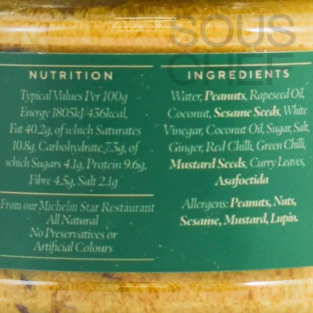 Product formulations and details may change. For the latest ingredients and allergen information always check product packaging prior to consumption. Ingredients: Water, peanuts 15%, rapeseed oil, coconut, sesame seeds 8%, white vinegar, coconut oil, sugar, salt, ginger, red chilli, green chilli, mustard seeds, curry leaves, asafoetida. Contains lupin.