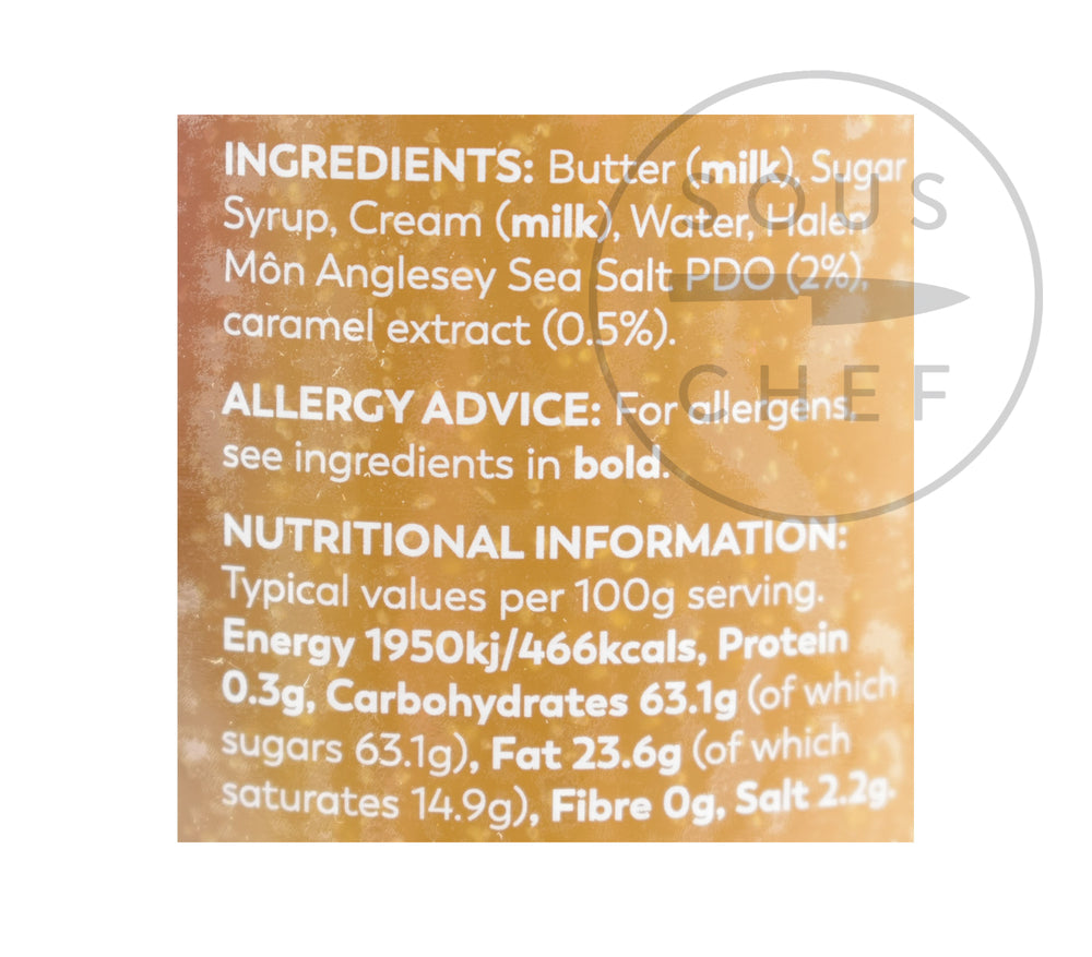 Product formulations and details may change. For the latest ingredients and allergen information always check product packaging prior to consumption. Ingredients: Butter (milk), sugar syrup, cream (milk), water, Halen Môn Anglesey sea salt PDO (2%), caramel extract (0.5%)